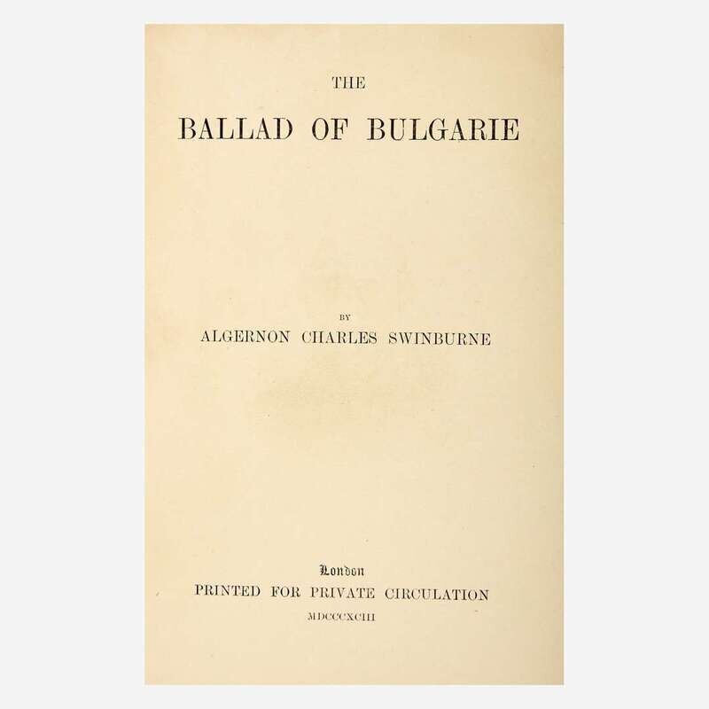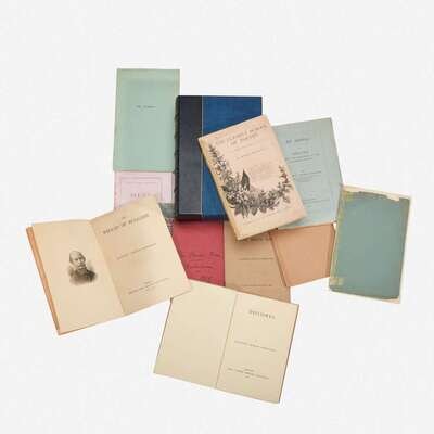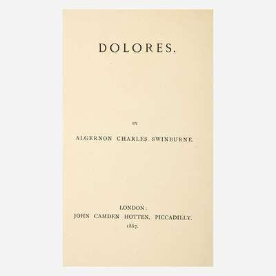 1. Siena Philadelphia: J.B. Lippincott & Co., 1868. First American edition. 16mo. 24 pp. Original limp pink printed wrappers, scattered minor wear, lightly faded; in blue cloth chemise and blue morocco and cloth slip case, with the below pamphlets. 2. The Bibelot: A Reprint of Poetry and Prose... Portland, Maine: Thomas B. Mosher, December 1898. Vol. IV, No. 12. 16mo. (xiv), 399-419, (15) pp. Swinburne's "Ave Atque Vale" on p. (409). Original limp blue printed wrappers, scattered wear. 3. Maitland, Thomas (pseudonym) The Devil's Due No place: For Private Circulation, 1875. First edition. 16mo. 11 pp. Original limp red wrappers, title inscribed on front wrapper, scattered minor wear; text leaves lightly toned. Includes leaves from the "Bibliography of Swinburne" about same. 4. The Ballad of Dead Men's Bay London: Privately Printed: 1889. First edition. 16mo. 14 pp. Original limp tan printed wrappers. 5. The Bride's Tragedy London: Privately Printed: 1889. First edition. 16mo. 15 pp. Later limp paper wrappers. 6. An Appeal to England Against the Execution of the Condemned Fenians Manchester, 1867. Reprinted From The "Morning Star". 12mo. 11 pp. Original limp blue printed wrappers. Lightly worn and soiled. 7. A Word for The Navy London: George Redway, 1896. Reissue. 12mo. 16 pp. Limp printed self-wrappers, spine repaired with tape, scattered minor wear. 8. The Question London: Charles Ottley, Landon, & Co., 1887. First edition. 12mo. 15 pp. Original limp blue printed wrappers, scattered minor edgewear and creasing. 9. The Brothers No place, 1889. First edition. 12mo. 8 pp. Original limp blue wrappers, spine repaired with tape, worn, losses along front and rear wrapper edges. 10. Buchanan, Robert The Fleshly School of Poetry and Other Phenomena of the Day London: Strahan & Co., 1872. First edition. 12mo. ix, (i), 97, (1), (4) (ads) pp. Original limp tan printed wrappers, spine repaired with tape, scattered minor wear. 11. Dolores London: John Camden Hotten, 1867 (but 1890s). Thomas J. Wise forgery. 12mo. 23 pp. Original limp tan wrappers; unopened. 12. The Ballad of Bulgarie London: Printed for Private Circulation, 1893. Thomas J. Wise forgery, one of 25 copies. 12mo. 15 pp. Original limp tan paper wrappers.