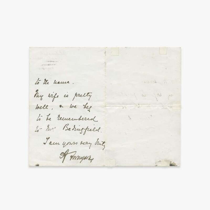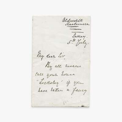 Aldworth (House), Haselmere, Surrey, July 5, no year (ca. 1875-92). One sheet folded to make four pages; 6 1/8 x 3 7/8 in. (155 x 98 mm). Autograph letter, signed by Tennyson to Sir Henry Bedingfield, Bart.: "My dear Sir,/By all means/call your house/"Locksley" if you/have taken a fancy/to the name./My wife is pretty/well, & we beg/to be remembered/to Mrs. Bedingfield./I am yours very truly/A. Tennyson" ("Locksley Hall" was a poem by Tennyson, first published in 1842). Creasing from original folds; tape remnants from old mount on corners of third page; ink stains on fourth page. Lot includes an engraved portrait of Tennyson.