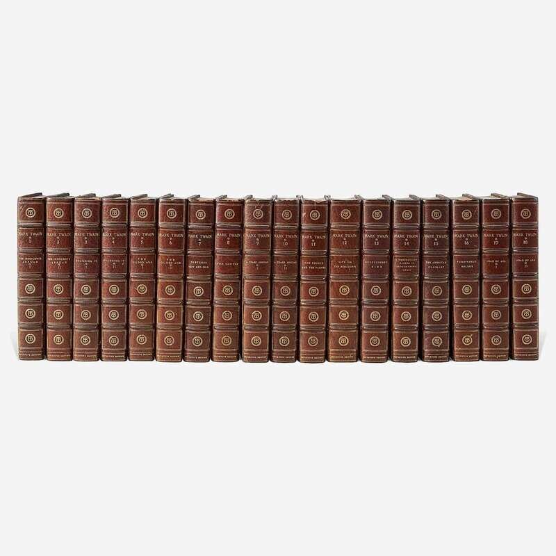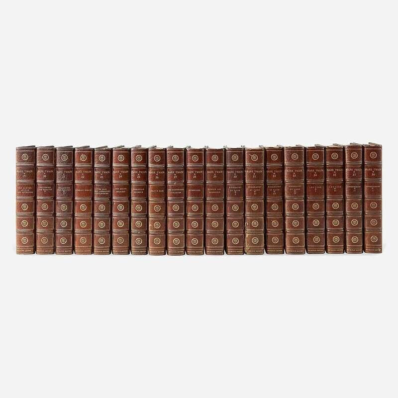 New York: Gabriel Wells, 1922-25. In 37 volumes. Definitive Edition, #452 of 1,024 numbered sets signed by Twain ("S.L. Clemens/Mark Twain") and by his biographer and literary executor Albert Bigelow Paine in first volume. 8vo. Each volume illustrated with frontispiece and plates; red captioned tissue guards. Three-quarter green levant, stamped in gilt, over marbled paper-covered boards, spines and extremities browned, scattered minor wear and rubbing to boards and joints, scattered minor chipping to spine ends, rear joint of Volume 9 largely split, bottom rear joint of Volume 31 cracked; top edges gilt, other edges untrimmed; front free endpaper folded over and creased in Volume 9, rear endpaper of same sprung, short closed tear at top edge of rear blanks in same; 3 in. closed tear at fore-edge of pp. 65/66 in Volume 14, horizontal tear traversing entire leaf of pp. 241/242 in same; pp. 57-60 sprung in Volume 25; horizontal tear traversing entire leaf of pp.563/564 in Volume 31; 2 1/2 in. closed tear at fore-edge of pp. 245-48 in Volume 36; book-plate on front paste-down of each volume. BAL 3691.