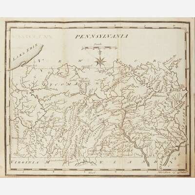Philadelphia: F. and R. Bailey, 1795. First edition. 12mo. vi, (288) pp. Illustrated with 19 engraved folding maps. Contemporary brown mottled calf, black morroco spine label, stamped in blind and in gilt, front and rear boards detached, boards and extremities rubbed and worn, spine ends chipped; all edges trimmed; large folding map at front worn with various separations along folds; scattered light spotting and offsetting to text and plates; book-plate on rear paste-down. Evans 29476; Howes S-237; Sabin 78331.