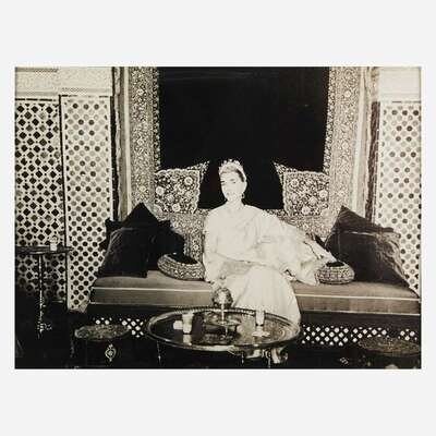 No date (ca. 1920s). Bromide print. Signed by Beaton in red ink, bottom right; "From the Beaton Studio, Sotheby Parke Bernet" ink stamp on verso. Mounted to board; oxidation along bottom edge; scattered surface scratches. Image: 19 3/4 x 15 3/4 in. (502 x 400 mm). In mat and frame; 29 1/4 x 23 1/8 in. (743 x 587 mm). Lot includes a ca. 1970s photographic reproduction of "Barbara Hutton in Tangier" (ca. 1961); 7 x 9 1/4 in. (178 x 235 mm). In frame; 12 1/4 x 14 1/2 in. (311 x 368 mm).