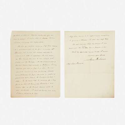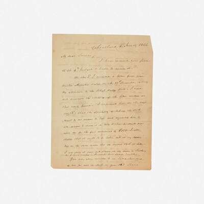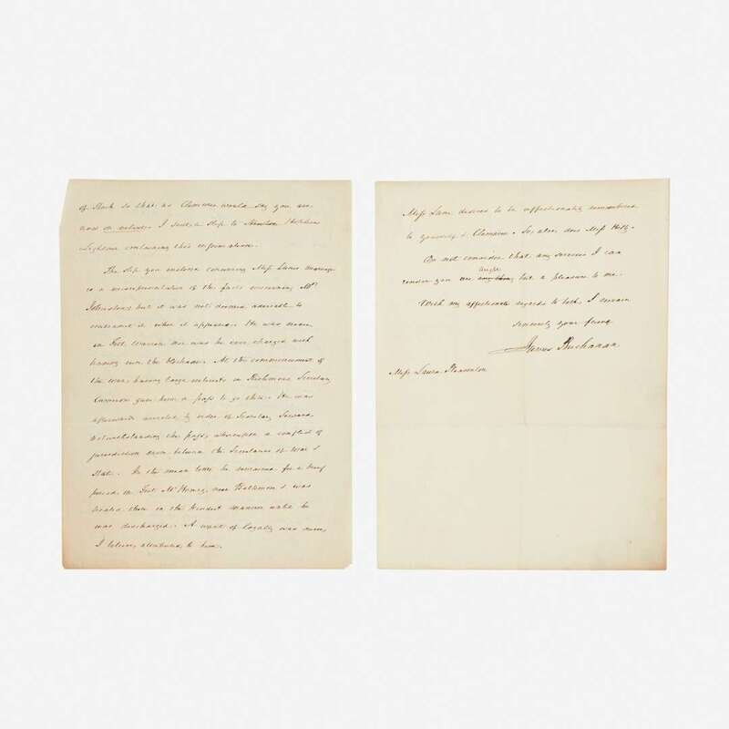 Wheatland, Lancaster County, Pennsylvania, January 6, 1866. 2 1/2 pages on two sheets; 8 1/4 x 6 1/4 in. (209 x 158 mm). Autograph letter, signed by Buchanan, to a Laura Pleasonton, discussing financial matters related to Lehigh Valley stock, as well as discussing allegations concerning Henry Elliott Johnston, husband of Buchanan's niece, Harriet Lane, about his arrest during the Civil War, at the behest of Secretary of War William H. Seward, for apparently running a blockade. Creasing from original folds; recto of first page toned. Lot includes a Lehigh Valley Railroad Co. stock certificate, as well as one engraved portrait of Buchanan.