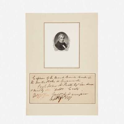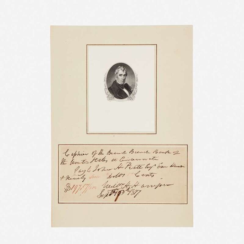 No place, September, 1817. Autograph check, signed by Harrison, directing the cashier of the Bank of the United States at Cincinnati, to pay John H. Pratt, $197.87. Date somewhat smudged; monetary amount signed in another hand, in red ink, faded; tipped onto sheet with an engraved portrait of Harrison. Includes one illustration of the interior of the White House, as well as one clipped biographical profile of Harrison.