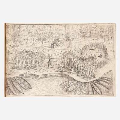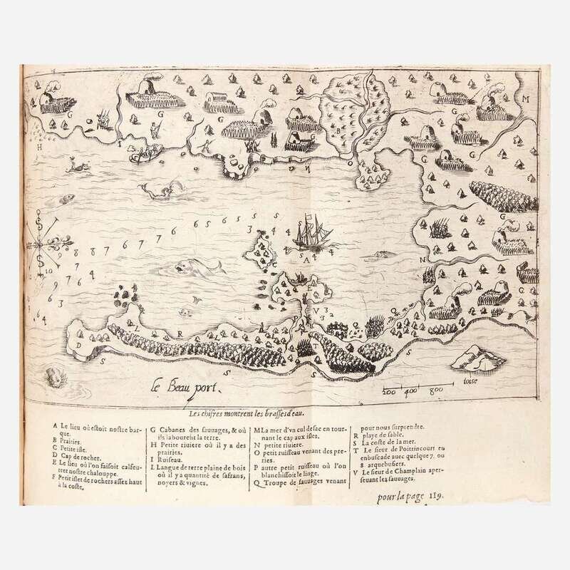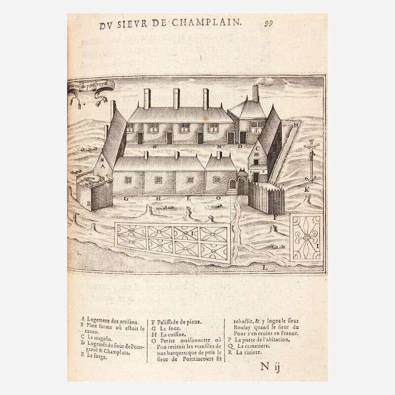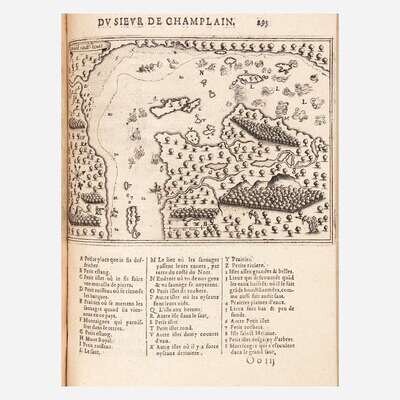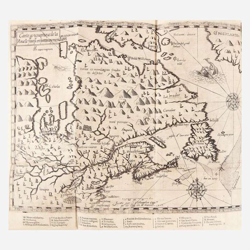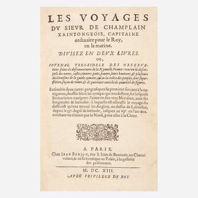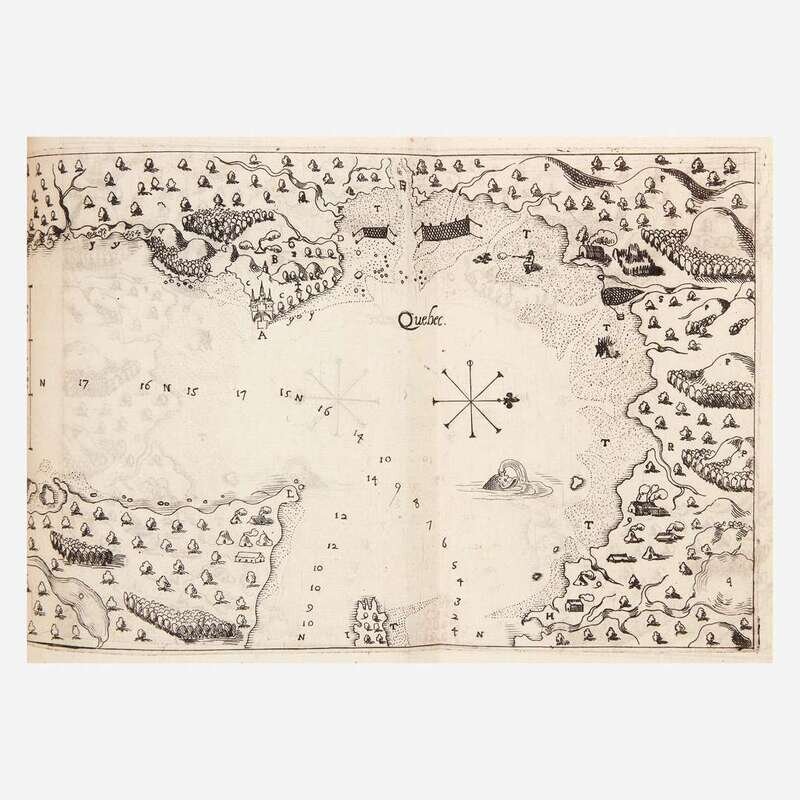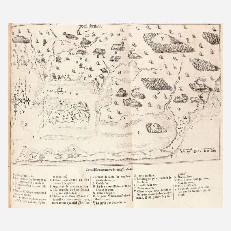 ... le France... Paris: Jean Berjon, 1613. First edition. Two parts in one. 4to (217 x 165 mm). (xx), 325, (5); 52 pp. Illustrated with three engraved folding plates, 8 engraved folding maps, 13 in-text engravings, and one woodcut diagram; large folding map "Carte Geographique de la Nouelle Franse Faictte..." in facsimile, linen backed, and bound facing p. 1; double-page map "Malle Barre" in facsimile, bound between pp. 88 and 89; folding map "Isle de sainte Croix" bound facing p. 134; map "Carte geographique de la Nouelle franse en sonaray meridien", second state (1613), linen backed and bound facing pp. 161; map "port fortune" repaired at bottom center; map on p. 9 corrected. Full red levant, stamped in gilt, expertly rebacked; all edges gilt; gilt dentelles; marbled endpapers; by W. Pratt for H. Stevens & Son 1889; bottom corner p. (vii/viii) repaired; two repairs in fore-edge p. 11/12; repairs at bottom p. 29/30; repair at bottom corner p. 109/110; repair top corner pp. 117/118; wormhole repairs bottom corner pp. 129-48; repair at bottom of map facing p. 176; scattered marginalia; scattered minor spotting. Church 360; Burden 160, 161, 166-81; Sabin 11835.