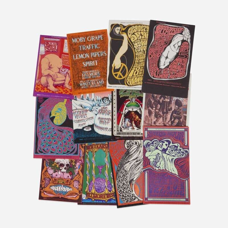 Circa 1960s. Nice group of 18 handbills (including 6 duplicates), from San Francisco's Fillmore Auditorium, Fillmore West, Winterland, and Avalon Ballroom, all with postcard backs. Condition A. Sizes vary (largest dimensions, 8 1/4 x 5 in.; 209 x 127 mm).