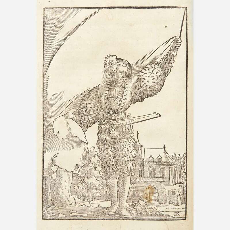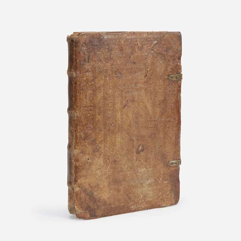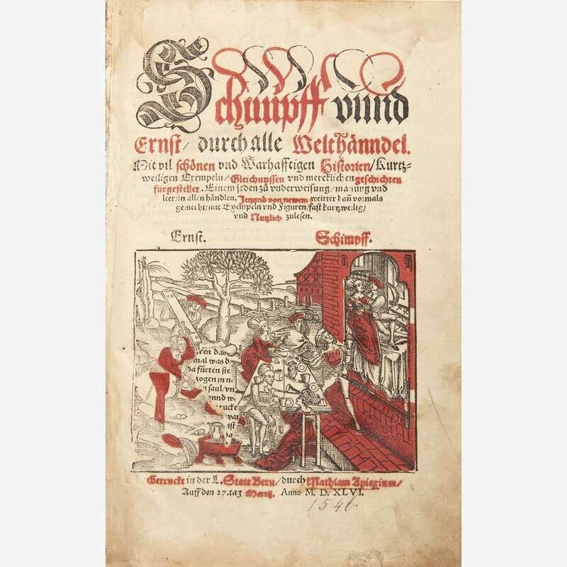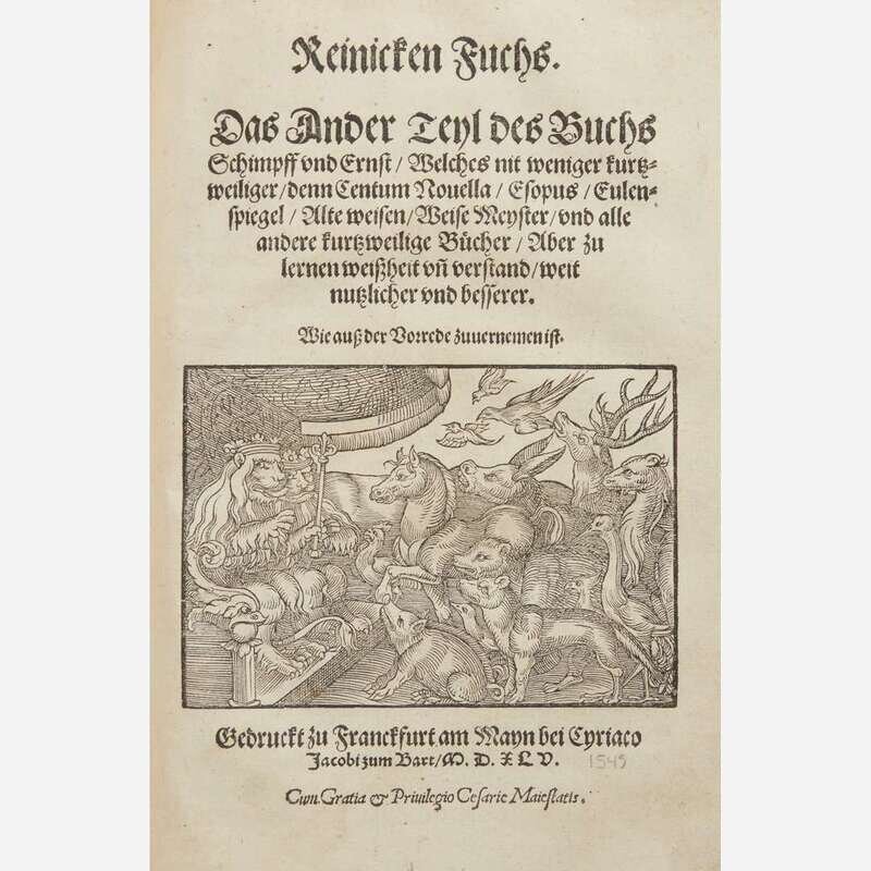 Bern: Mathiam Apiarium, 1546. 4to. Presumed first edition in German. (196), (4) pp. Illustrated with woodcut title-page printed in red and black and 40 in-text woodcuts. Contemporary full pigskin, elaborately stamped in blind, over wooden boards, original brass clasps intact, spine ends worn, boards rubbed and worn; all edges trimmed; front hinge worn; lacking front free endpaper; hole torn, bottom title-page, with loss to woodcut; worming at bottom of first nine leaves; dampstaining at head, upper gutter, and some margins of most leaves; small loss at bottom corner of ff. X; abrasions to woodcut on verso ff. XV; 2 3/4 in. closed tear at bottom ff. LIV; small holes torn in woodcut on verso ff. LXXXV; small loss at top corner of ff. XC; short close tear top edge ff. XCI, small loss and tear at bottom corner of same; other scattered soiling, spotting, and creasing to text; armorial ownership signature on front paste-down, institutional ink stamp of "St. Salvator Karten Bogensberger" (Austria), other inscriptions on same. OCLC 245969541 Bound with: Reinicken Fuchs. Das ander teyl des buchs... Frankfurt am Main: Cyriaco Jacobi, 1545. Presumed first edition in German. (viii), (230) pp. Illustrated with woodcut title-page and one woodcut plate. Dampstaining in gutter and margins of most leaves; scattered marginalia; repaired closed tear at bottom of woodcut plate; loss at top corner ff. CV; inscription on recto rear free endpaper and paste-down; scattered soiling, creasing, and spotting to text. OCLC 633937200.