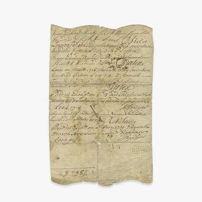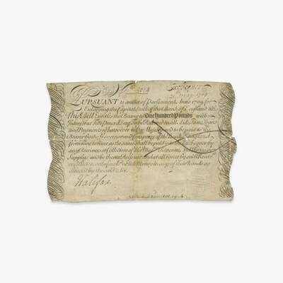 England, May 21, 1709. 4 7/8 x 7 1/2 in. (124 x 190 mm). This 3% enlargement loan is an early and rare partially printed Bank of England £100 stock, signed by Lord Halifax at bottom; MS. on verso recording various transactions; creasing from original folds; scattered soiling.