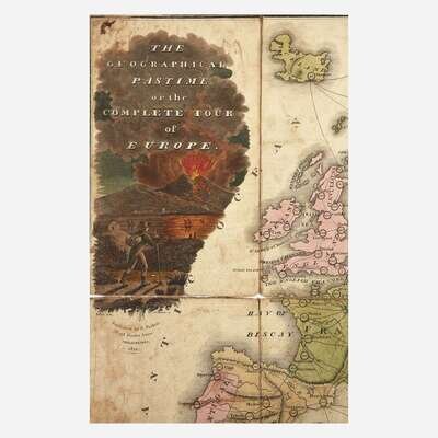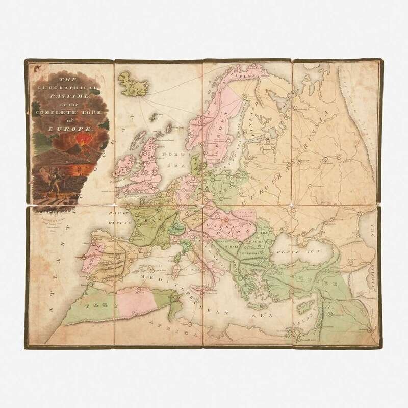 Philadelphia: E. Parker, 1822. Large folding game, comprising eight hand-colored engraved panels, including one large hand-colored cartouche, top left panel; mounted to linen; 18 1/4 x 22 1/2 in. (463 x 571 mm). Engraved by Seymour after a drawing by Birch. Scattered separations along folds; contemporary ownership signature on marbled panel verso. OCLC 642976772.