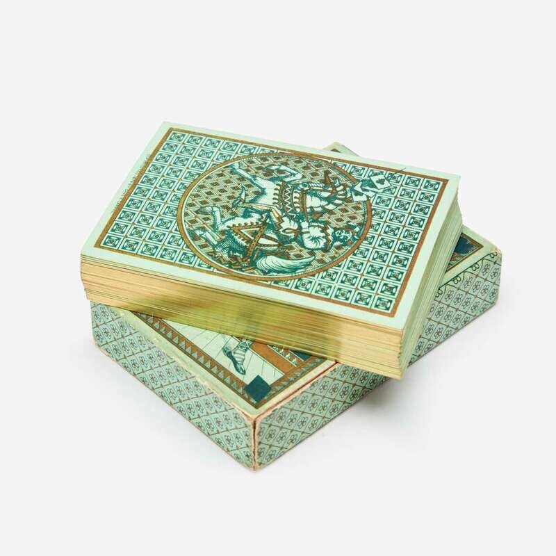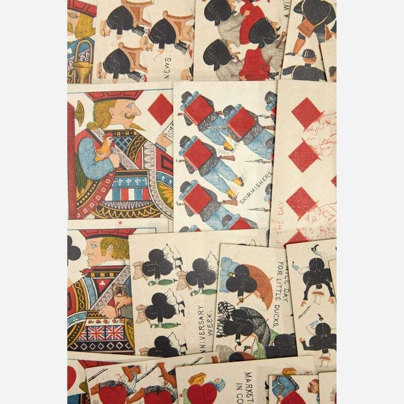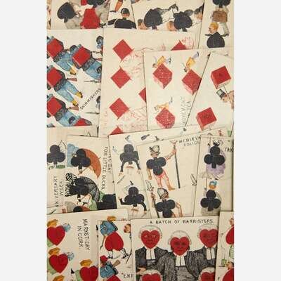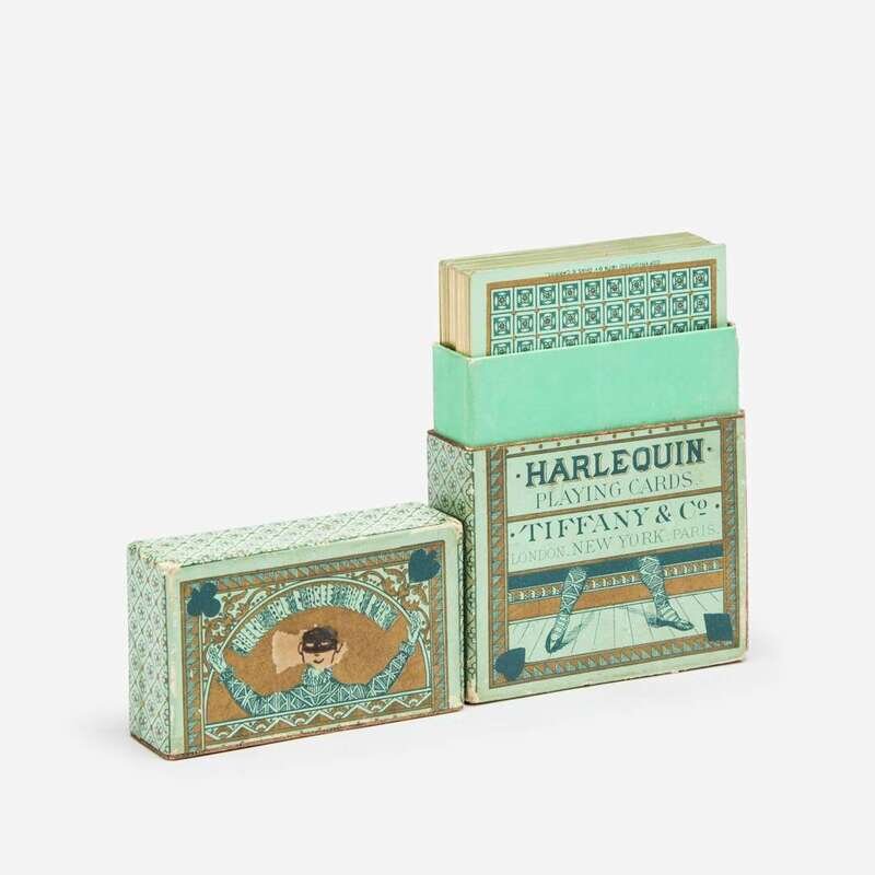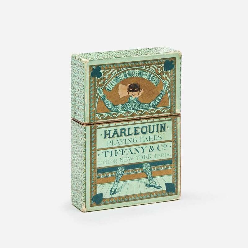 New York, Paris and London: Tiffany & Co., 1879. 3 3/4 x 2 5/8 in. (95 x 67 mm). Complete deck of 52 chromolithograph transformation cards in original printed box. Appear never to have been played with: all edges gilt; corners square; no wear of any kind; box bottom split cleanly at one corner.