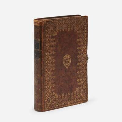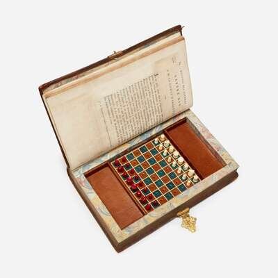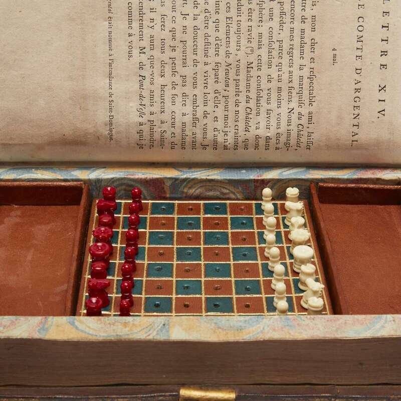 An eighteenth-century edition of Voltaire made into a traditional secret book box, hiding a miniature fully functional chess set of white and red pieces on an ocean blue and tan leather board. 8vo. Full mottled calf, elaborately tooled in gilt; marbled endpapers.