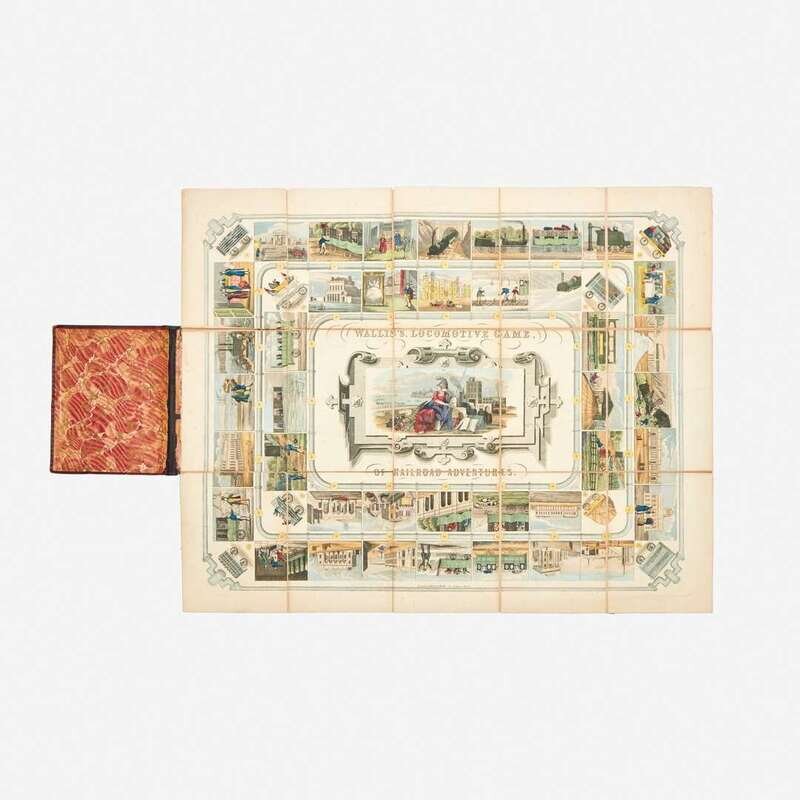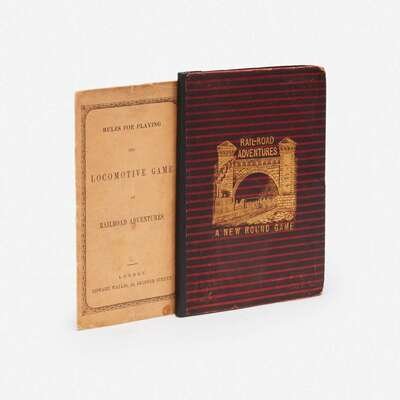 London: Edward Wallis, no date (ca. 1840s). Large folding game, comprising 15 hand-colored aquatint panels; mounted to linen; 19 5/8 x 24 in. (498 x 609 mm); mounted to red and black striped cloth-covered folder (7 x 5 3/8 in; 178 x 136 mm), stamped in gilt, rebacked; marbled endpapers; scattered light soiling and toning to panels. Together with: Rules for Playing the Locomotive Game of Railroad Adventures London: Edward Wallis, no date (ca. 1840s). 12mo. 12 pp. Original limp tan printed wrappers, lightly worn, scattered light soiling.