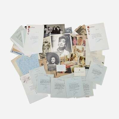 Large archive of approximately 85 pieces as listed below: T.L.s. - May 30, 1936 - signed "Joan Crawford" T.L.s. - March 5, 1956 - signed "Joan Crawford" T.L.s. - May 11, 1951, to Genie Chester, in envelope T.L.s. - May 18, 1951, to Genie Chester, in envelope and with two Christmas gift tags addressed to Chester by Crawford, laid in A.L.s. - undated, to Genie Chester, on her light blue "Joan" stationery, 3 pp. A large group of correspondence with Pepsi-Cola executive and close friend, Ray Helsel, all signed "Joan" except where noted: T.L.s. - December 29, 1966 T.L.s. - February 18, 1968 - signed "Joan Crawford" T.L.s. - January 29, 1969 T.L.s. - March 26 1969 T.L.s. - Christmas, 1969 T.L.s. - January 7, 1970 T.L.s. - March 26, 1970 T.L.s. - Christmas, 1970 T.L.s. - January 4, 1971 T.L.s. - May 16, 1971 T.L.s. - Christmas, 1971 T.L.s. - December 28, 1971 T.L.s. - March 27, 1972 T.L.s. - August 27, 1973 T.L.s. - Christmas, 1973 T.L.s. - December 31, 1973 T.L.s. - June 26, 1974, 2 pp. T.L.s. - Christmas, 1974 T.L.s. - January 20, 1975 T.L.s. - February 18, 1975 A.L.s. - undated, on her light blue "Joan Crawford" stationery, 2 pp. A.L.s. - undated, on her light blue "Joan Crawford" stationery A.L.s. - undated, on her light blue "Joan Crawford" stationery A.L.s. - undated, on one of her "Miss Joan Crawford" visiting cards A.L.s. - undated, on one of her "Miss Joan Crawford" visiting cards Printed Christmas card - undated, inscribed and signed A.L.s. - undated, on what appears to be a Ritz-Carlton dining table place card 5 Western Union Telegrams, Telefaxes, and Mailgrams, 1969-75 Typed envelope with Crawford's pre-printed name and New York City address Other items: 2 vintage signed 10 x 8 in. black and white photographs 2 vintage 7 x 9.5 in. black and white photographs 1 vintage 8 x 10 in. black and white photograph 1 vintage 9.5 x 7 in. black and white photograph 5 vintage 3.5 x 5 in. color photographs, 1960s (1 is a duplicate) 1970 Pepsi-Cola press release 23 pp. of newspaper and magazine clippings 1 greeting card 1 auction catalogue 1 postcard for above 9 pp. of photocopies.