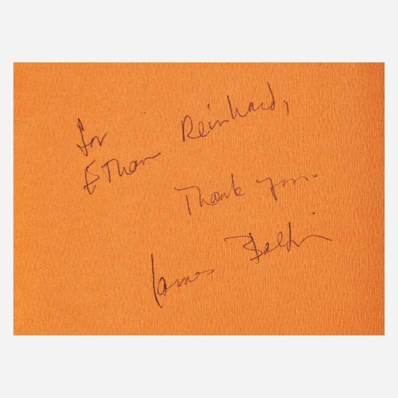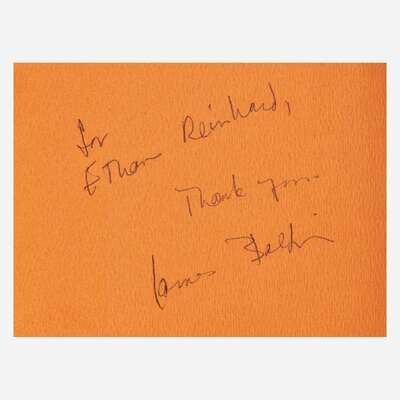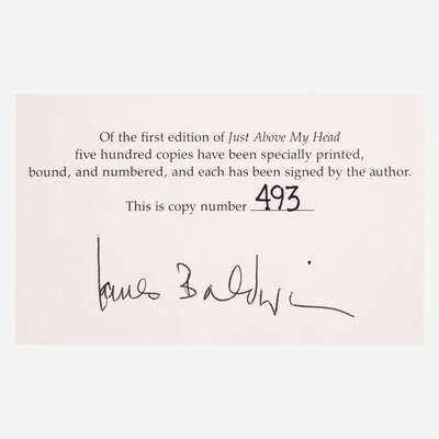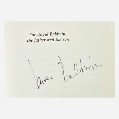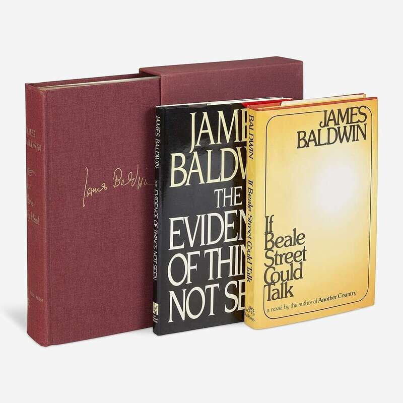 If Beale Street Could Talk New York: The Dial Press, 1974. First edition. 8vo. 197 pp. Inscribed: "For/Ethan Reinhard,/Thank you./James Baldwin" on front free endpaper. Original red-orange cloth, stamped in silver and in gilt; orange endpapers; top edge stained yellow; in unclipped dust-jacket. A fine copy. Together with: Just Above My Head New York: The Dial Press, (1979). First and limited edition, #493/500 numbered copies, signed by Baldwin on colophon. 8vo. 597 pp. Original red cloth, stamped in gilt, spine lightly faded; marbled endpapers; all edges gilt; in matching cloth-covered slip case, bottom right corner bumped. A near-fine copy. Together with: The Evidence of Things Not Seen Holt, Rinehart and Winston, (1985). First edition. 8vo. 125 pp. Signed by Baldwin on Dedication page. Original quarter black cloth, stamped in silver, over black paper-covered boards; top and bottom edges trimmed, fore-edge untrimmed. A fine copy.