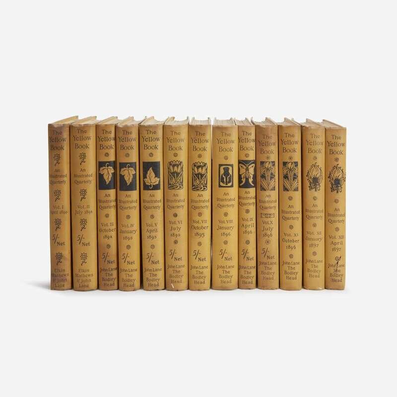 London: Elkin Mathews, et al., April 1894-April 1897. In thirteen volumes. Later issues (without ads at rear, and with "April" spelled correctly on front board of first volume). 8vo. Edited by Henry Harland. Original pictorial yellow cloth, stamped in black, scattered minor soiling to boards, spine slightly darkened; all edges trimmed; partially unopened; scattered foxing to text and plates; offsetting to front and rear paste-downs; first, fourth, eighth, and ninth volumes in original glassines, variously worn. Lasner 65.