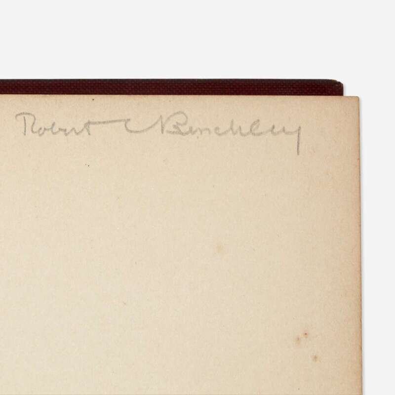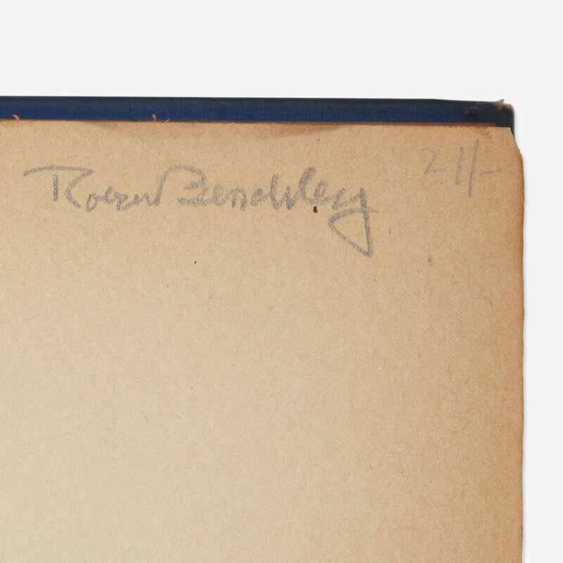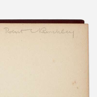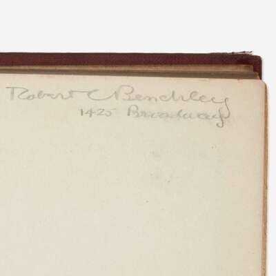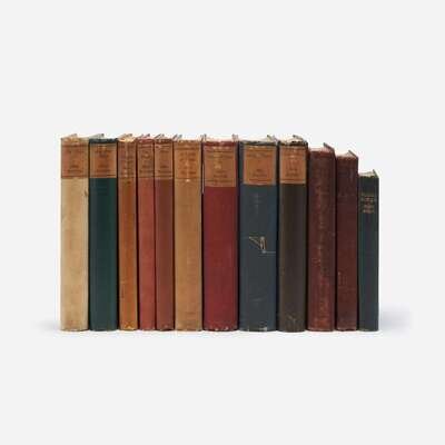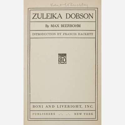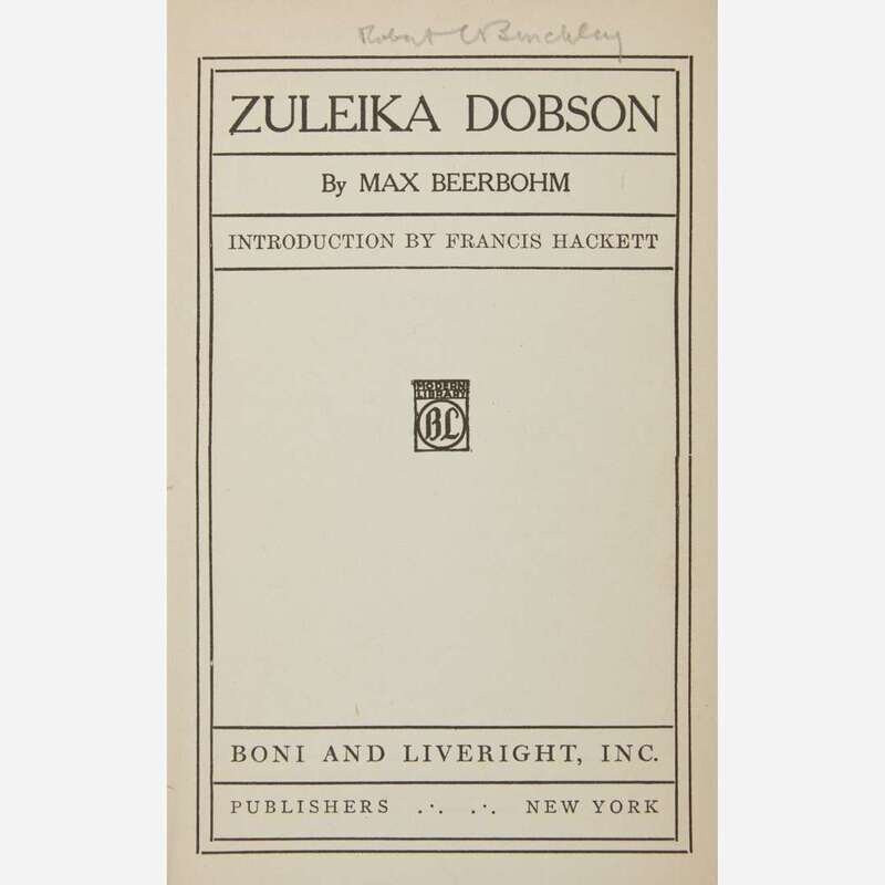 1. A Christmas Garland New York: E.P. Dutton & Company, 1918. Reprint. 12mo. 197 pp. Original red cloth, stamped in gilt, spine darkened; all edges gilt; scattered foxing throughout. From the library of famed Algonquin Round Table charter member Robert Benchley and with his ownership inscription: "Robert C. Benchley" in pencil on front free endpaper. 2. Zuleika Dobson New York: Boni and Liveright, Inc., no date (ca.1918-19). Reprint. Modern Library edition. 12mo. 358 pp. Green flexible leatherette, stamped in gilt, slightly cocked; all edges trimmed. From the library of Robert Benchley and with his ownership inscriptions: "Return to Bob Benchley" in pencil on front free endpaper and "Robert C. Benchley" in pencil on title-page. 3. And Even Now New York: E.P. Dutton & Company, (1921). Second printing. 8vo. 320 pp. Red cloth, stamped in gilt, spine darkened; top edge trimmed, other edges untrimmed. From the library of Robert Benchley and with his ownership inscription: "Robert C. Benchley/1425 Broadway" in pencil on front free endpaper. 4. Works of Max Beerbohm London: William Heinemann, 1922-1928. In nine (of 10) volumes (Vol VII, "Seven Men" is wanting). #724/750 sets (from a total edition of 780) signed by Beerbohm (in first volume). Interestingly, there is a price of 21/- in both volumes of "Around Theatres" leading one to believe the set was possibly put together by Benchley from multiple sources and could explain the missing volume. 8vo. Variously bound in yellow, green, dark red, white, blue, purple, brown, red, and black cloth, paper labels to spines, all variously faded or darkened; all edges untrimmed, dust-jackets wanting. The set Includes 1: The Works of Max Beerbohm; 2: More; 3: Yet Again; 4: And Even Now; 5: A Christmas Garland; 6: Zuleika Dobson; 8: Around Theatres, Vol. I; 9: Around Theatres Vol. II; 10: A Variety of Things. No ownership marks except "Robert Benchley" in pencil on front free endpaper of first volume of "Around Theatres," news clipping laid in to same; postcard addressed to Mrs. Robert Benchley laid in to "And Even Now"; news clipping laid in to "A Christmas Garland". Presumably Benchley's wife Gertrude was responsible for the ephemera, as was her custom.