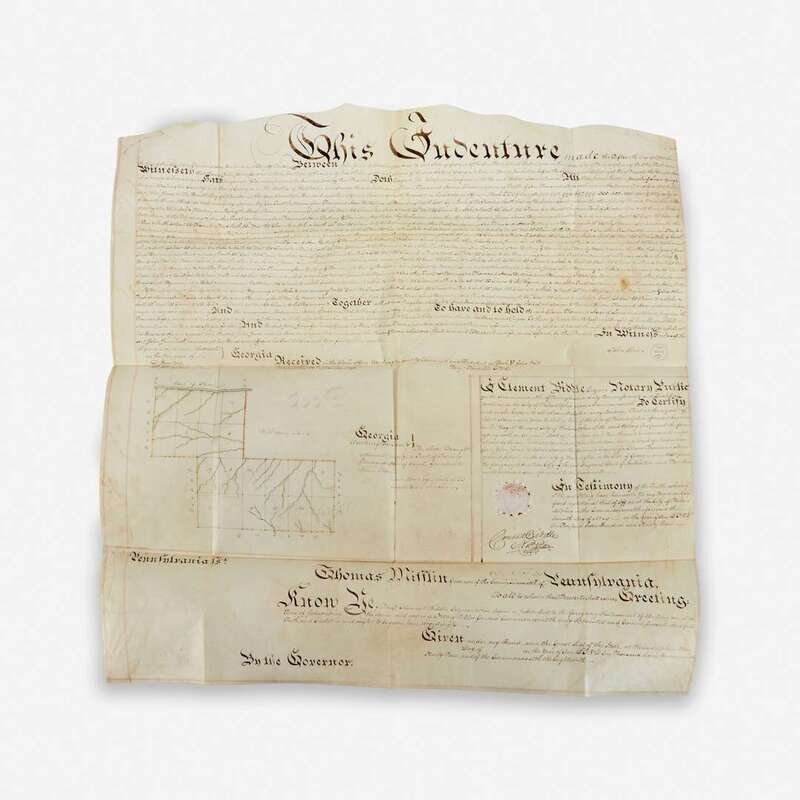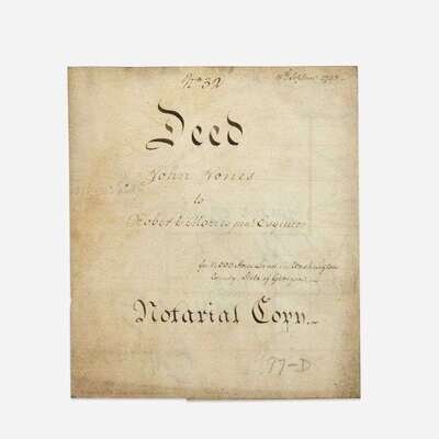 Washington County, Georgia, September 15,1793. Land deed, signed in a secretarial hand, on vellum for 11, 000 acres from a John Jones to Founding Father Robert Morris, signed by Philadelphia notary public, Clement Biddle, seal intact at same. Creasing from original folds. 27 1/2 x 25 1/2 in. (698 x 648 mm).