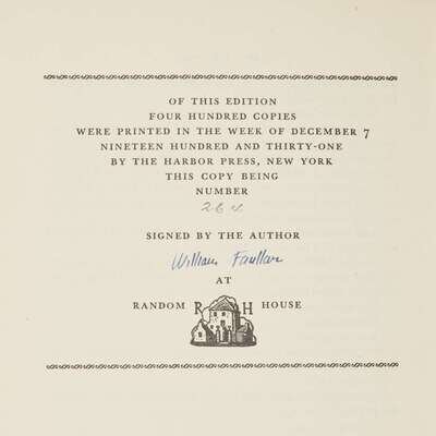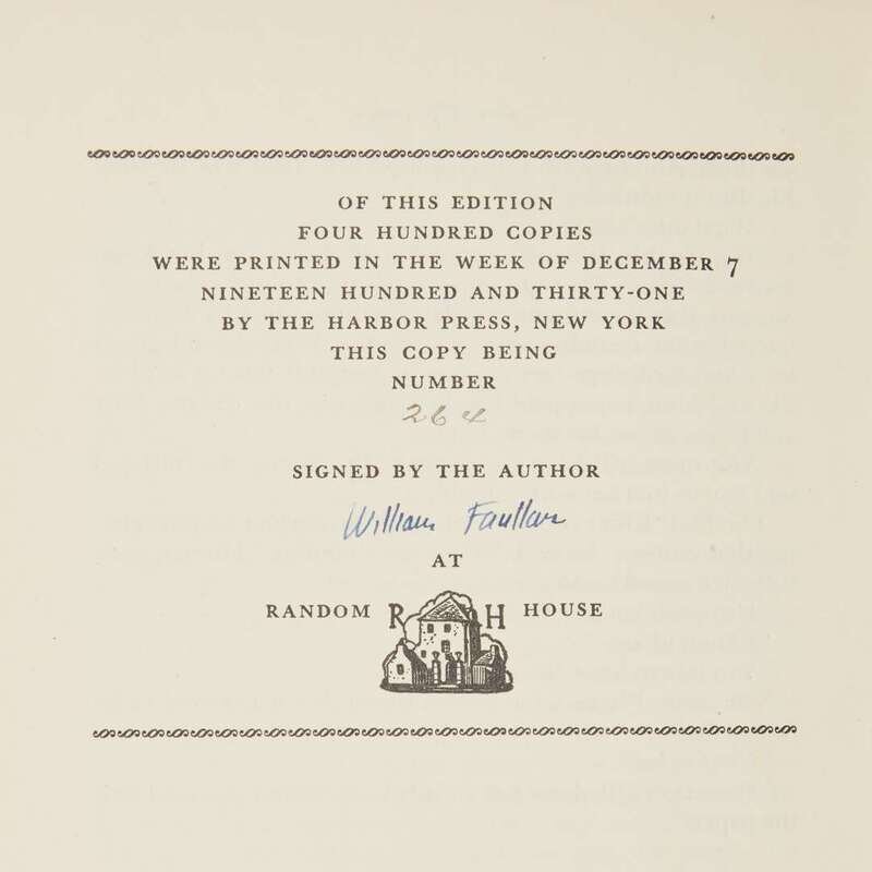 New York: Random House, 1931. First and only edition, #264/400 copies signed by Faulkner. 8vo. 17 pp. Original red marbled paper-covered boards, paper label to front board; completely unopened; original glassine dust-jacket. A fine copy. Petersen A10.1.