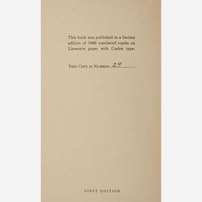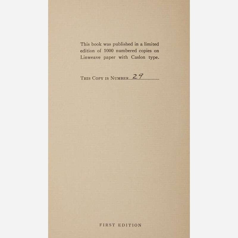 Cleveland: The J.B. Savage Company, 1938. First and limited edition, #29/1,000 numbered copies. 8vo. 60 pp. Illustrated by Frederick K. Russell. Original tan cloth, stamped in orange and in black; first issue pictorial “F.A.I.” endpapers; glassine dust-jacket wanting. A near-fine copy. Hanneman 15A.