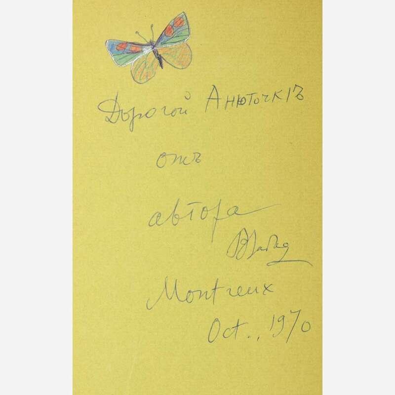 London: Weidenfeld and Nicolson, (1969). First English edition. 8vo. (xiv), 589 pp. Presentation copy, signed and inscribed with a butterfly drawing to Vera Nabokov's close cousin, Anya Feigin, dated October, 1970. Original red cloth, stamped in gilt; in original unclipped olive green dust-jacket. Nabokov, an accomplished lepidopterist, only included butterfly drawings in books inscribed to those especially important to him. The closer the connection, the more elaborate the drawing. Field 0885.