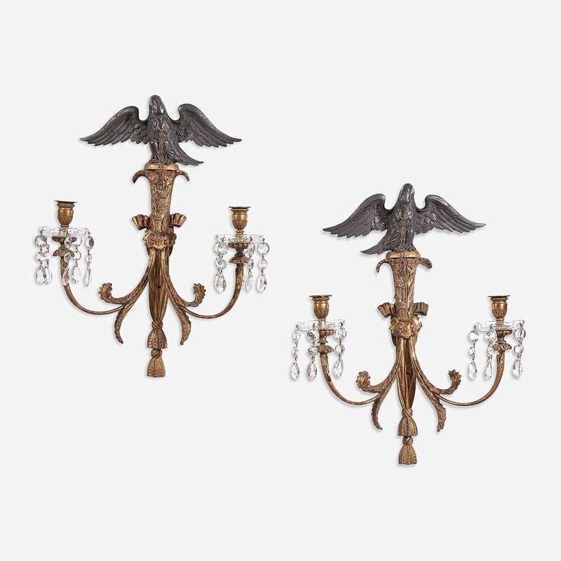 A Pair of Regency Style Gilt and Ebonized Wood and Cut Glass Two-Light Wall Sconces 19th/20th century