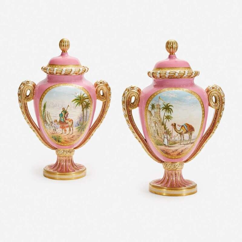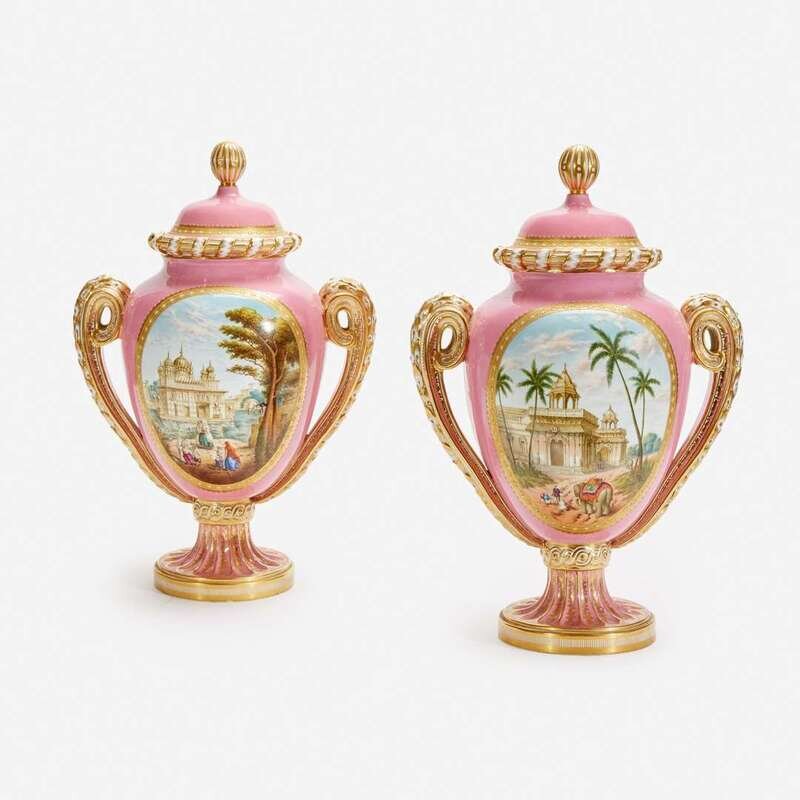 A Pair of Coalport Hand-Painted and Parcel-Gilt 'Rose du Barry' Porcelain Covered Urns Circa 1861-1875
