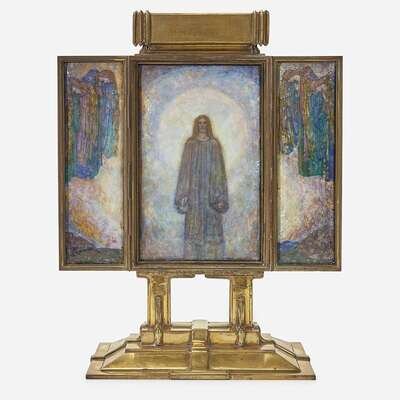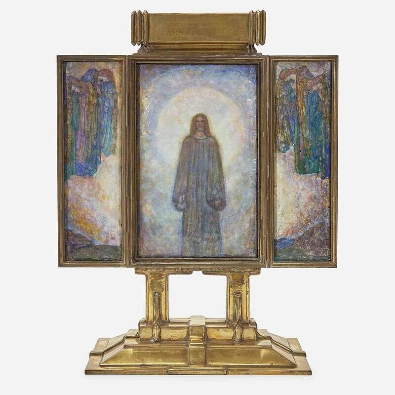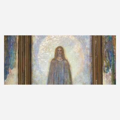 The two hinged panels resembling medieval doors opening to reveal a triptych depicting Christ in the central panel flanked by side panels each depicting two supplicant angels over a heavenly Jerusalem, apparently unsigned.
