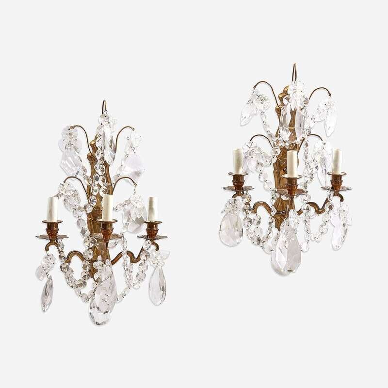 A Pair of Louis XV Style Gilt-Metal and Cut Glass Three-Light Sconces Late 19th/early 20th century