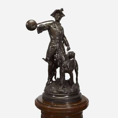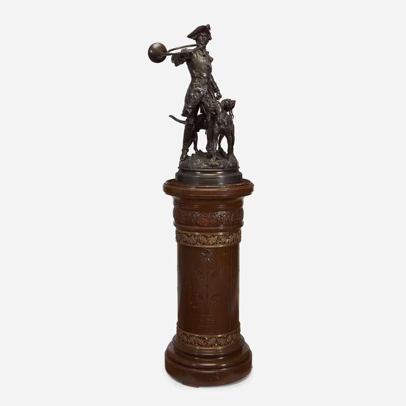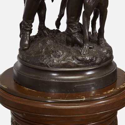 Bronze dark brown patina, signed and titled in cast "Hip. Moreau. Le courtier," the base mounted with title plaque "HIPPOLYTE MOREAU/SALON DES BEAUX-ARTS;" sold together with gilt-metal mounted and carved wood pedestal.