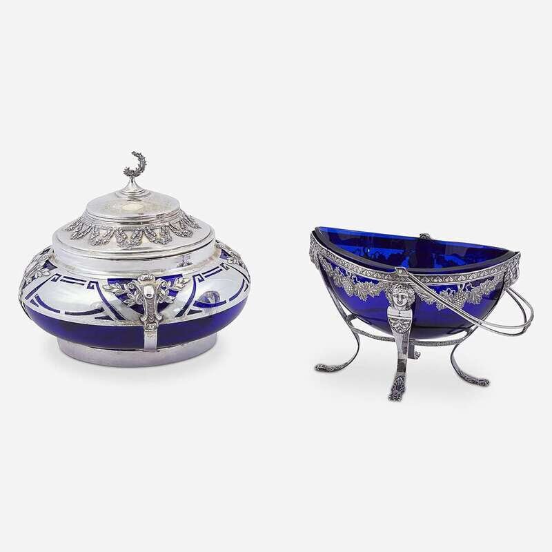 The first a German covered silver-mounted cobalt glass lined dish, marked 800; the second a silver cobalt glass lined sugar basket, the silver apparently unmarked. (2).
