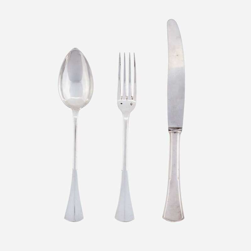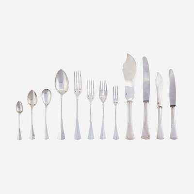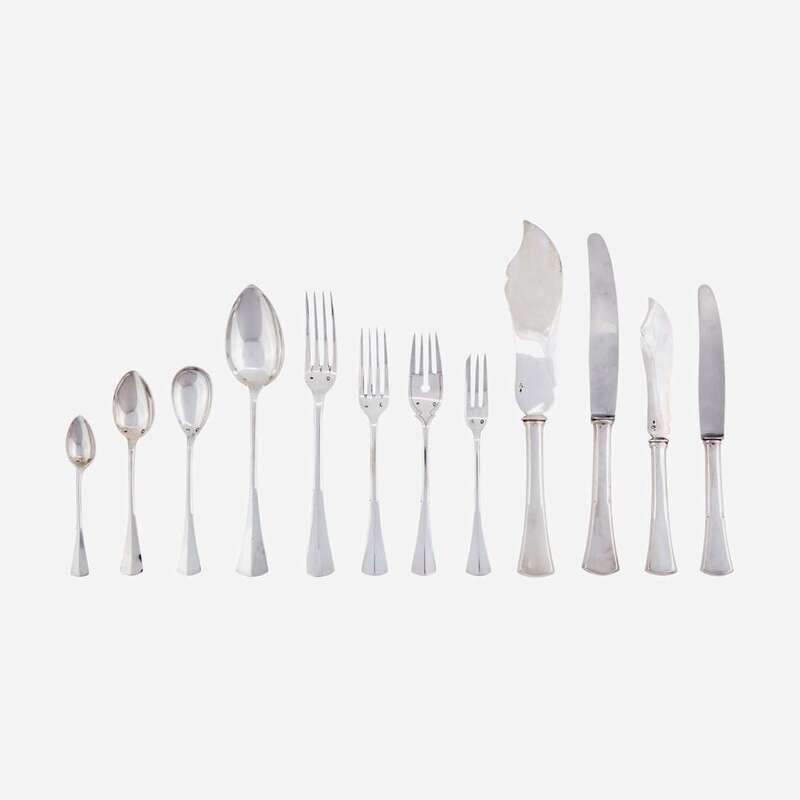 Comprising fourteen teaspoons; thirteen tablespoons; twelve each dinner forks, luncheon forks, fish forks, three-tined cake forks, steel-bladed dinner knives, steel-bladed luncheon knives, fish knives, bouillon spoons, and demitasse spoons; four meat forks of two sizes; three serving spoons of two forms; two serving scoops; one each fish server, fish serving fork, pierced and fluted serving spoon, cake server, tongs, and ice cream spoon; all marked with the 800 standard mark, Budapest assay mark, and various maker's marks, the steel knife blades marked "ROSTFREI SOLINGEN," and stored in a fitted wood silver chest; sold together with two unassociated silver salt cellars with conforming salt spoons, marked 800, maker AP, Czechoslovakia, 20th century. (approx. 154).