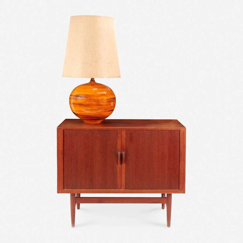 Glazed ceramic, wood, fabric shade.