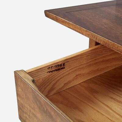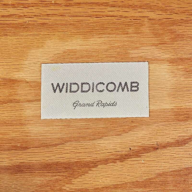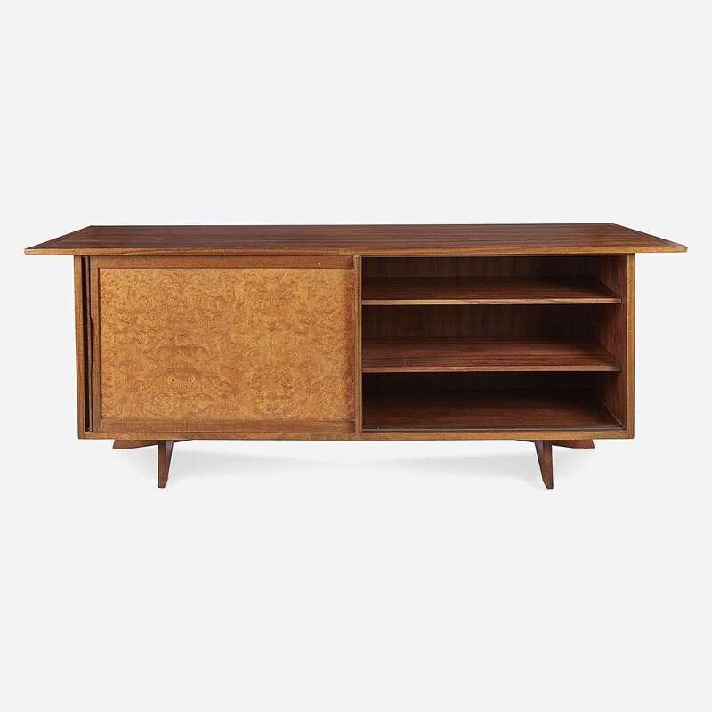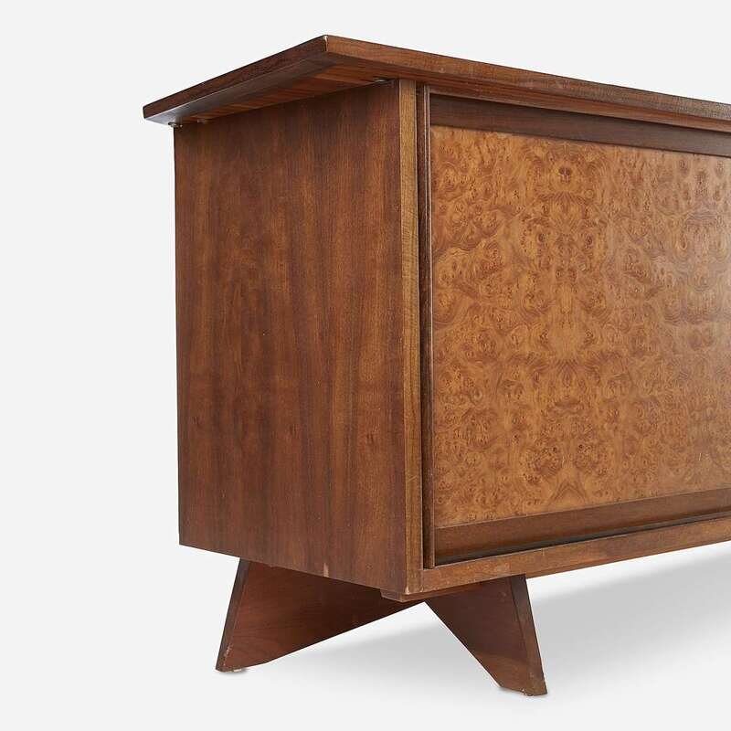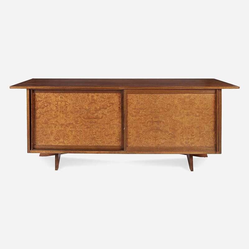 Walnut, Carpathian elm burl Branded signature: "George Nakashima", applied manufacturer's label "Widdicomb, Grand Rapids", stenciled marking: "Sundra 205 3/61"