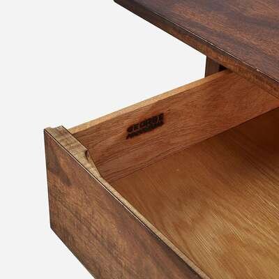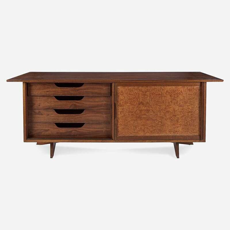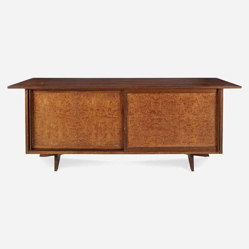 Walnut, Carpathian elm burl Branded signature: "George Nakashima", applied manufacturer's label "Widdicomb, Grand Rapids", stenciled marking: "Sundra 205 3/61".