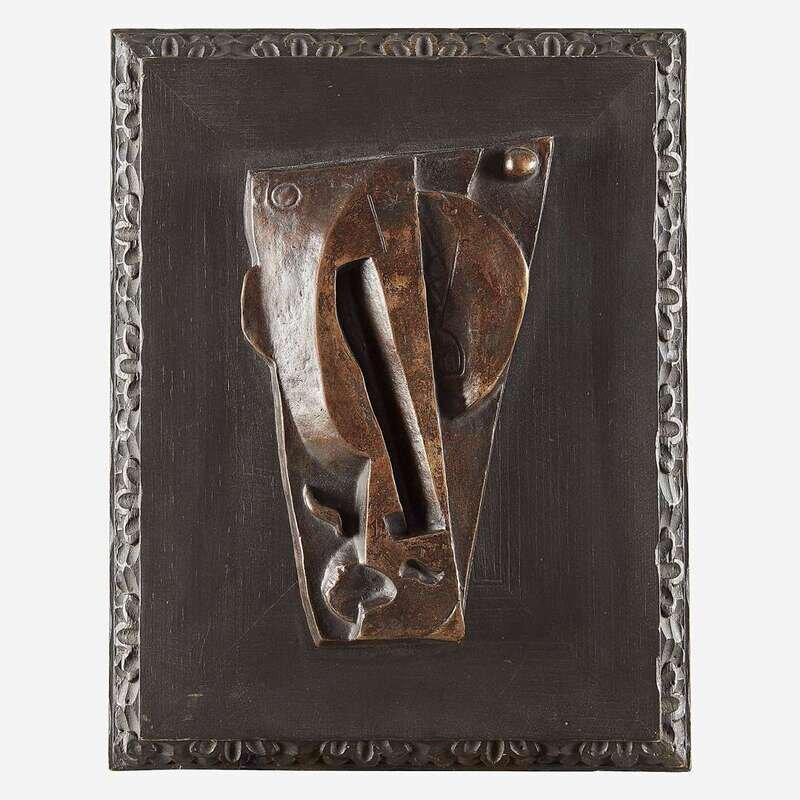 Circa 1919 (later cast), incised with signature along bottom edge, bronze with brown patina mounted on wood frame.