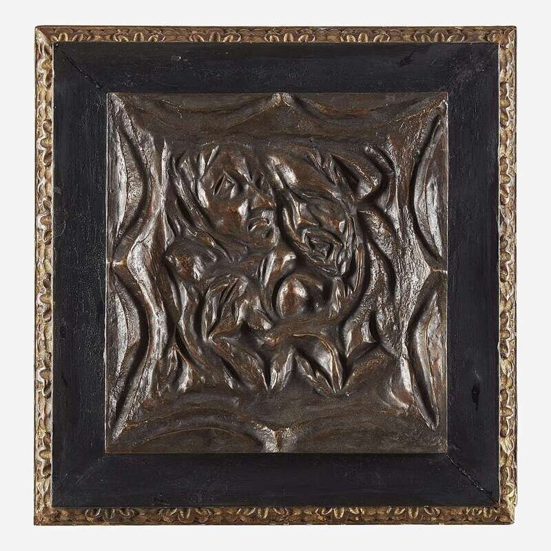 Incised with signature along left edge, bronze relief with brown patina mounted on wood frame.