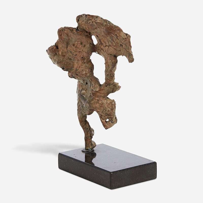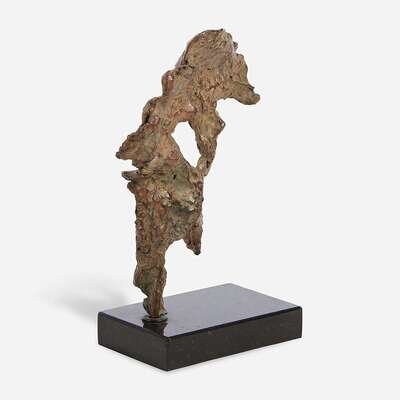Incised with initials along left edge, bronze with brown/red patina on marble base.