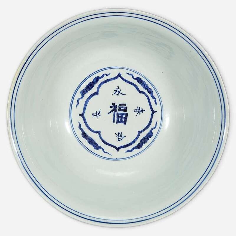 Decorated with prunus, lingzhi, and insects on the body, a band of ruyi-heads above the foot; the interior decorated with cloud scrolls and characters reading: "Yong Bao Chang Chun" centered by "Fu" within a lobed medallion, underside inscribed with the six character mark "Da Ming Jiajing Nian Zhi".