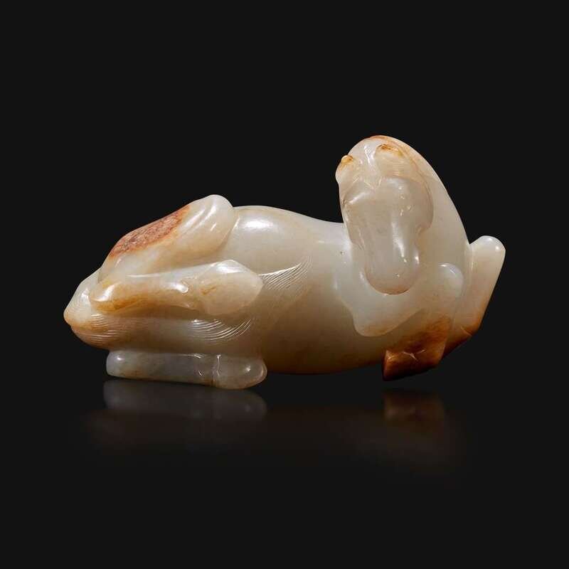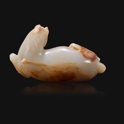 A Chinese russet and greyish-white carved jade figure of a recumbent horse