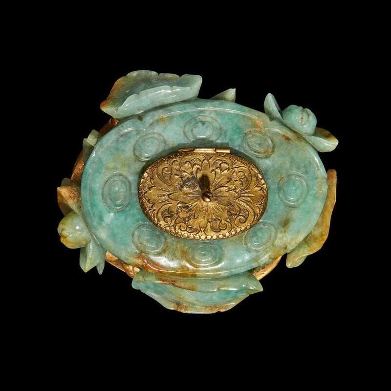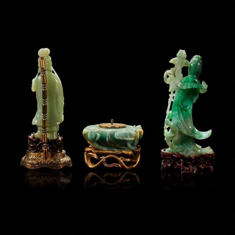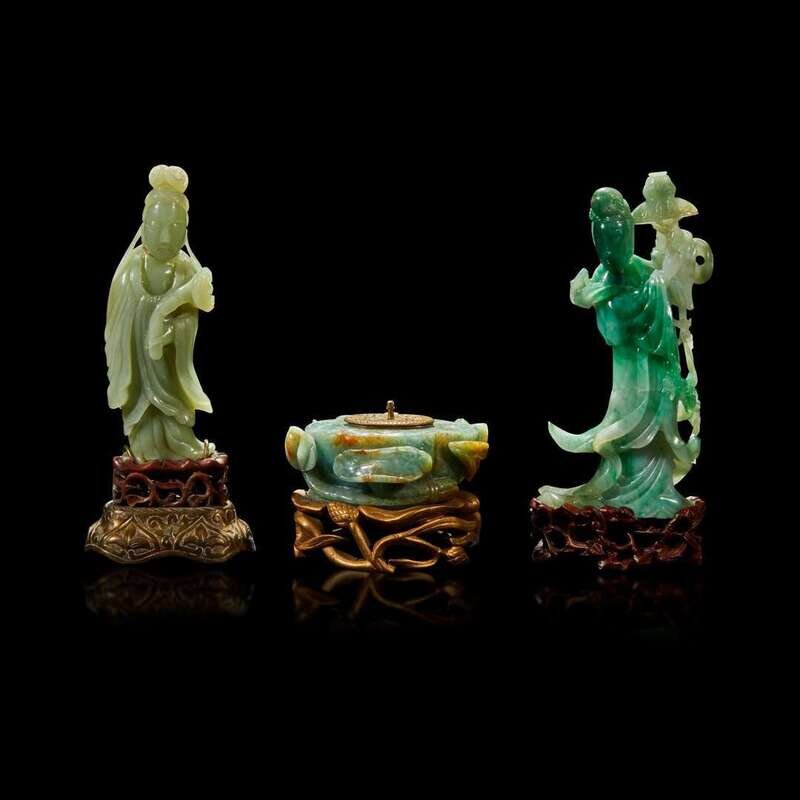 The jadeite meiren swinging a lotus shaped basket along with carved openwork flowers, the wood stand elaborately carved with prunus and bamboo; the celadon jade meiren holding a lingzhi ruyi scepter, mounted on a carved wood and a gilt metal pedestal base; the inkwell with a hinged gilt metal cover incised with floral design, mounted to the gilt openwork vine and foliage carved base (3).