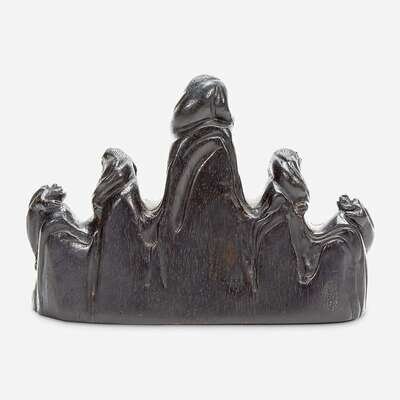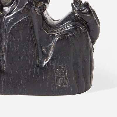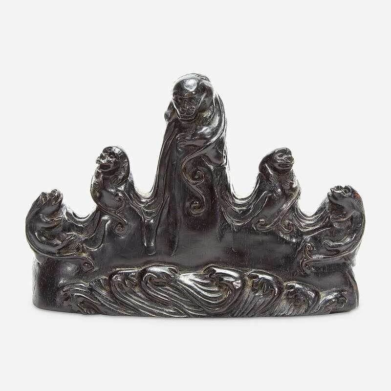 Of dense hardwood, depicting five qilong clinging to five peaks of a mountain with waves crashing below, one seal mark carved on back.