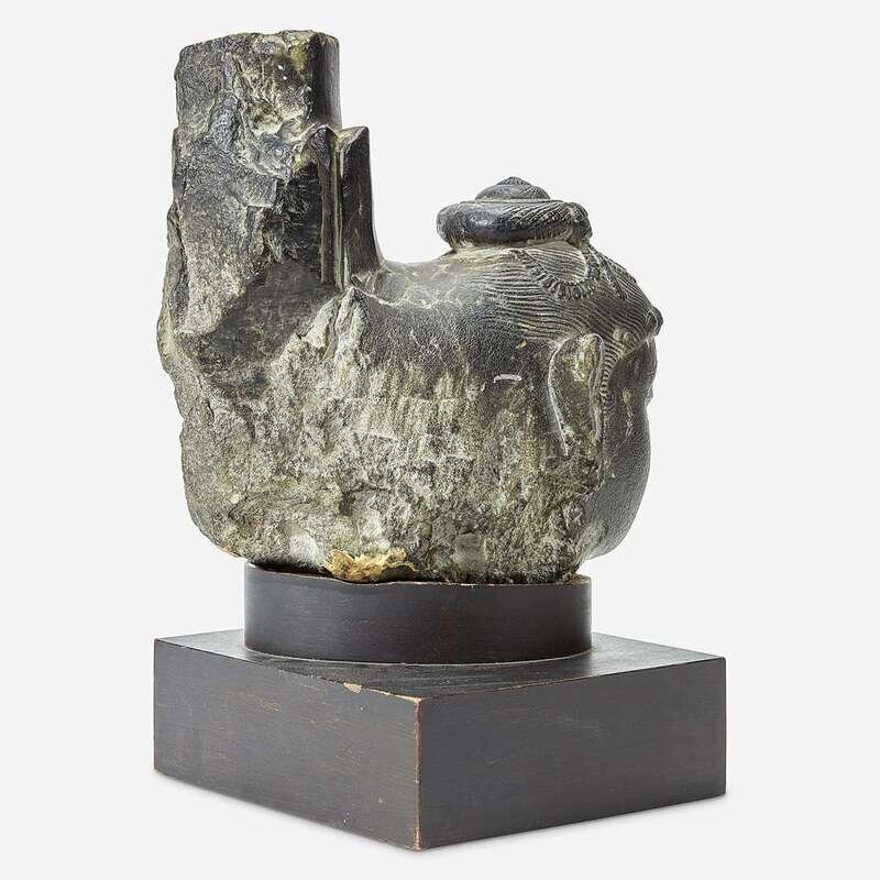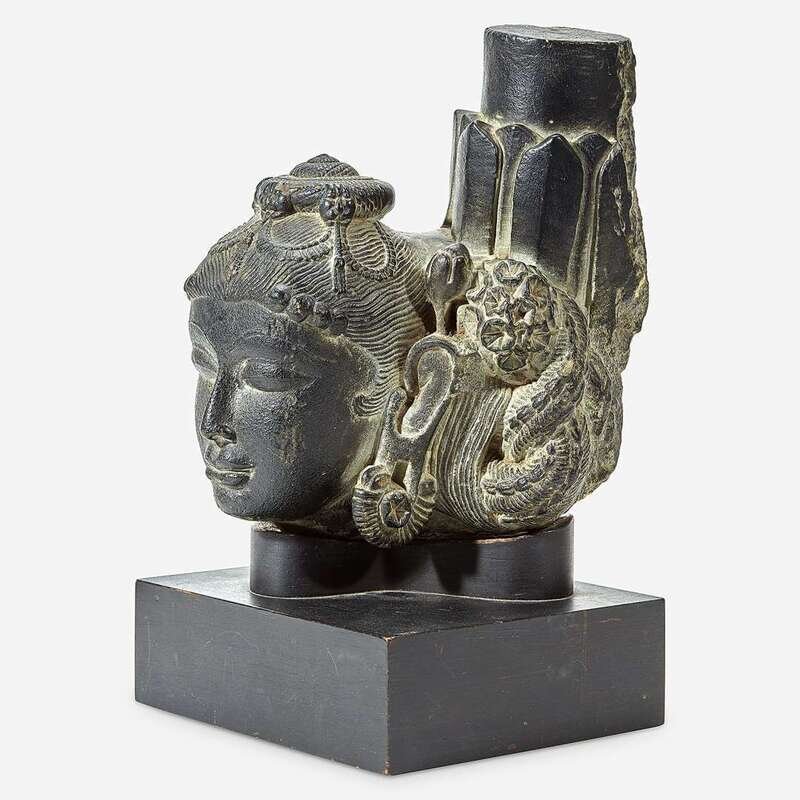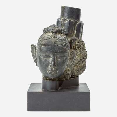 An Indian carved black stone head of a female Gahadavala Dynasty, 12th Century