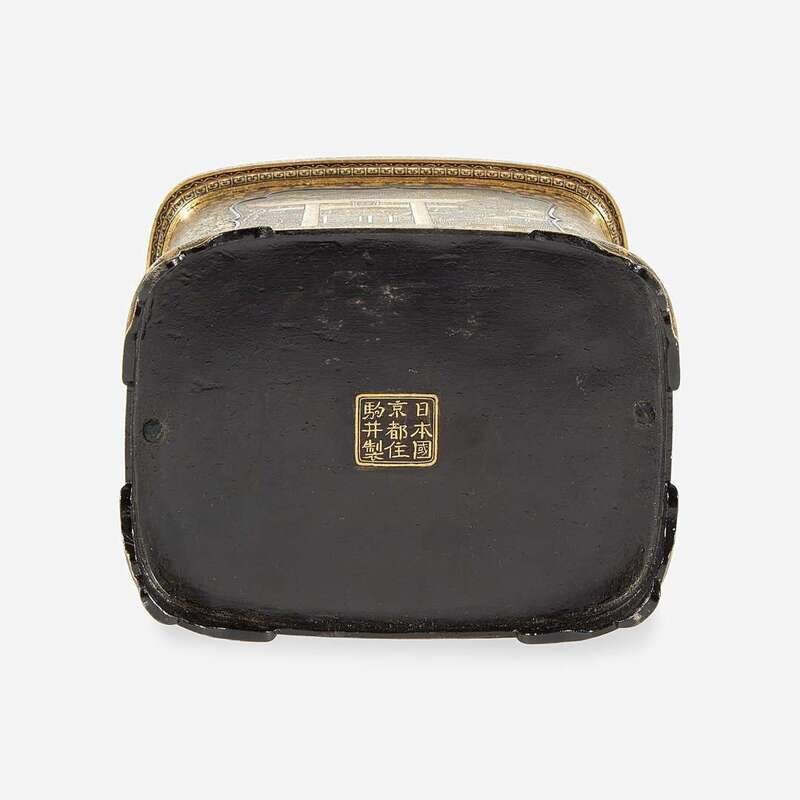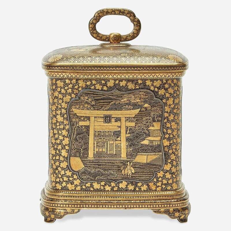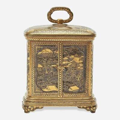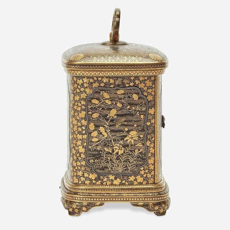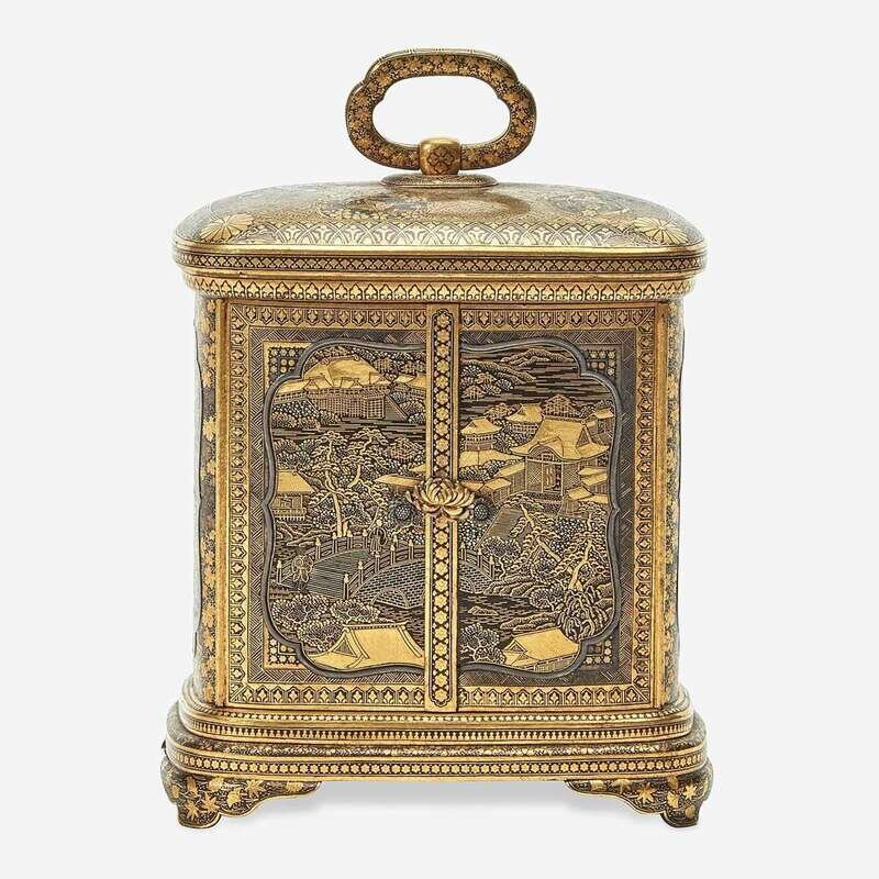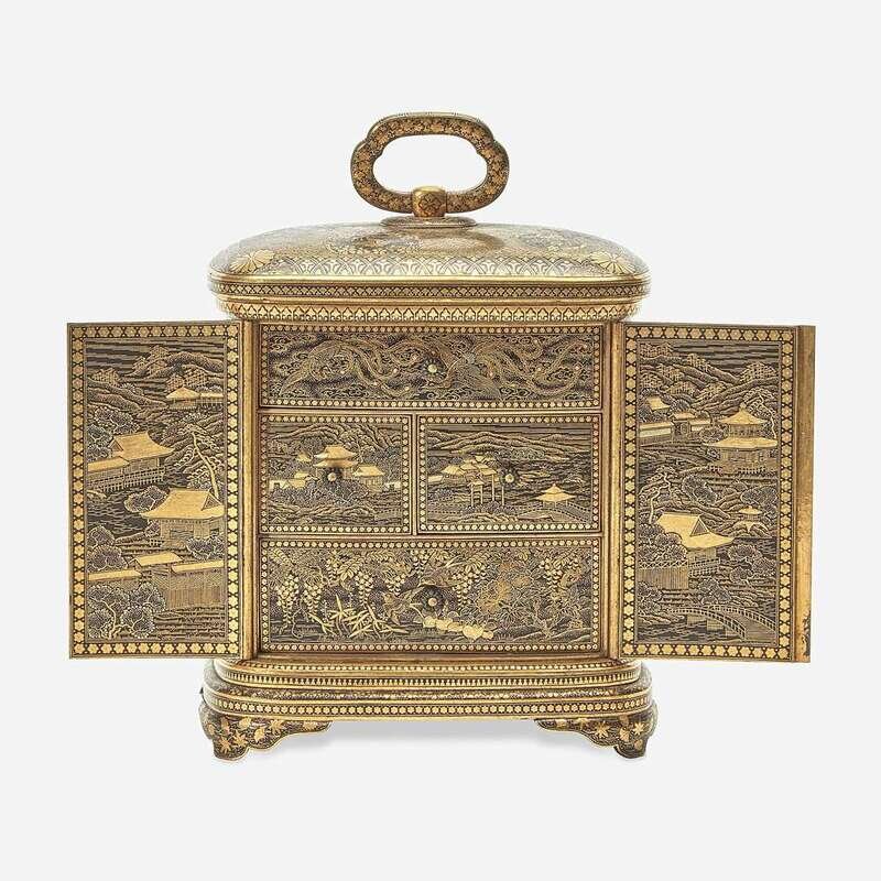 Of rectangular form with two doors and a floriform clasp, the doors opening to reveal four drawers of different sizes, each with floral pulls; the sides of the cabinet richly inlaid and decorated with cartouches, one depicting an architectural landscape, another of a torii gate and shrine, and two with floral patterns; the rounded top with a ring handle; all raised on four bracket feet; the underside with Komai nine-character mark; the interior with an old note inscribed "Ladies jewel box Damascene ware Japan-Toykio [sic] 1896"