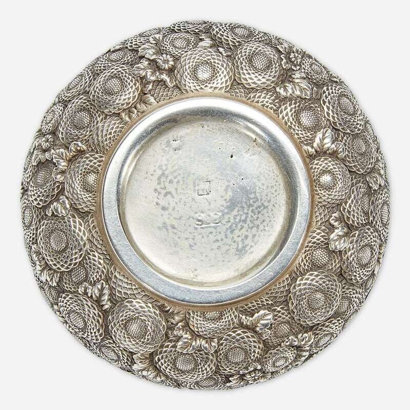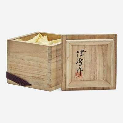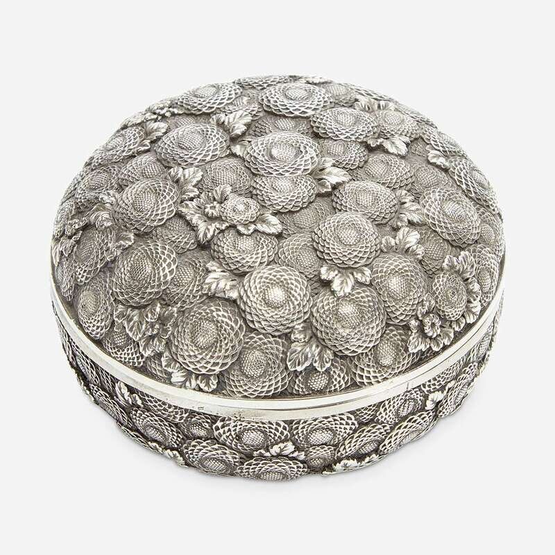 The heavy silver box of compressed globular form, densely modeled with chrysanthemum blossoms and leaves, matte interior, underside stamped 900 and with indistinct mark; Japanese wood box, cover inscribed Gensei, sho jiku kogo (small chrysanthemum kogo), interior of cover inscribed Tsusetsu saku.