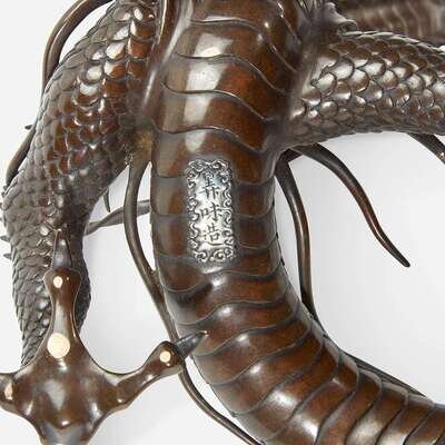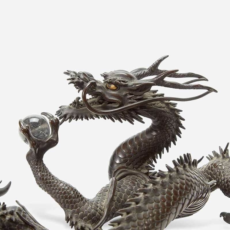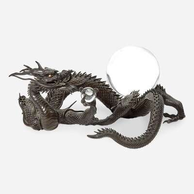 The finely-modeled sinuous three-clawed dragon clutching a small rock crystal sphere in one claw, its eyes gilt, bearing a larger loose rock crystal sphere on its back, the underside of the belly inlaid with a cartouche inscribed "Kazumi Zo" (2).