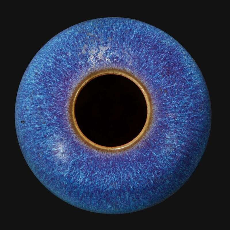 The mottled purple glaze draining to sky-blue at the foot, underside with a glossy "cafe-au-lait" glaze, shallow footring.