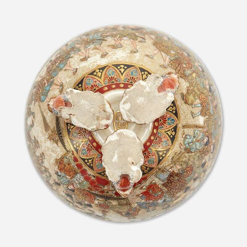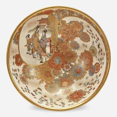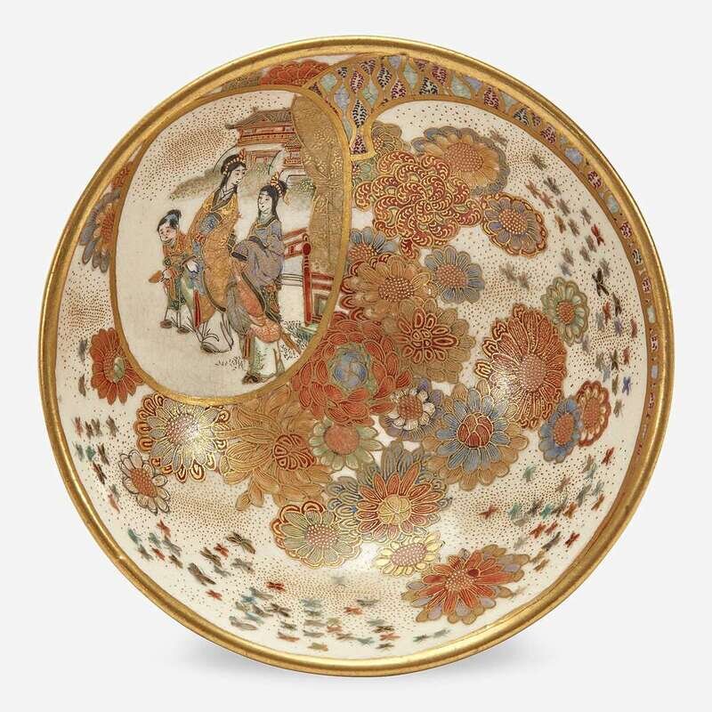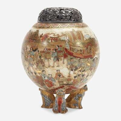 The koro richly decorated with figures in a procession in a landscape, three shishi-form feet, the silver cover modelled with prunus blossoms, underside possibly signed Ryokuzan; Bowl richly decorated with flowers and figures, underside inscribed.