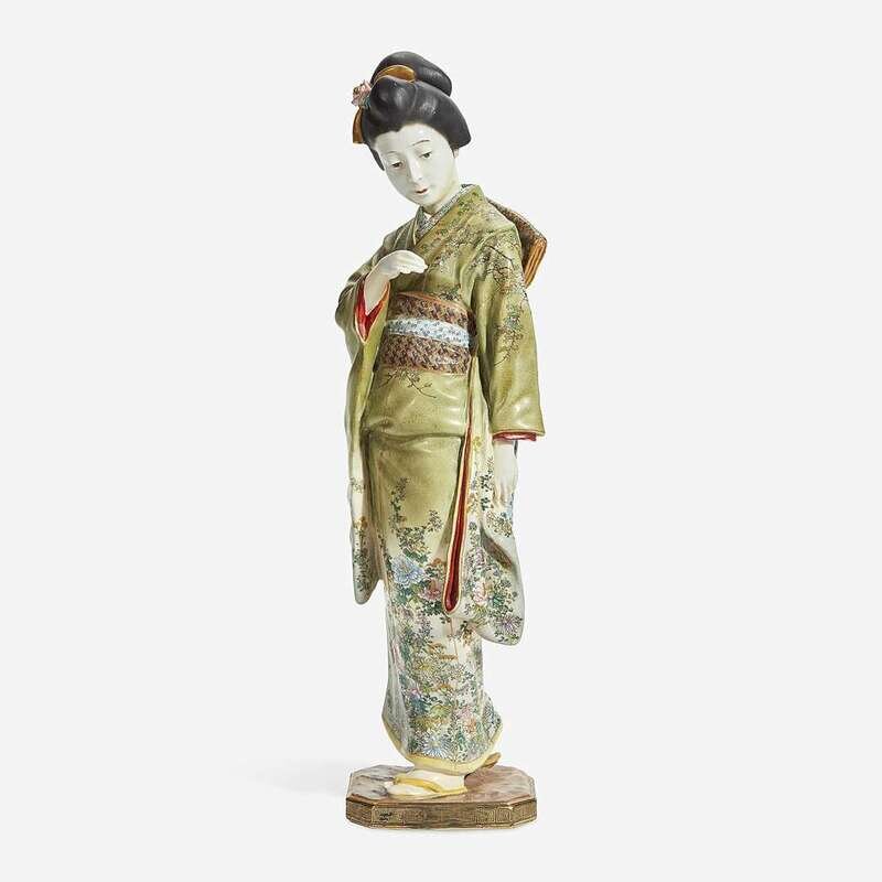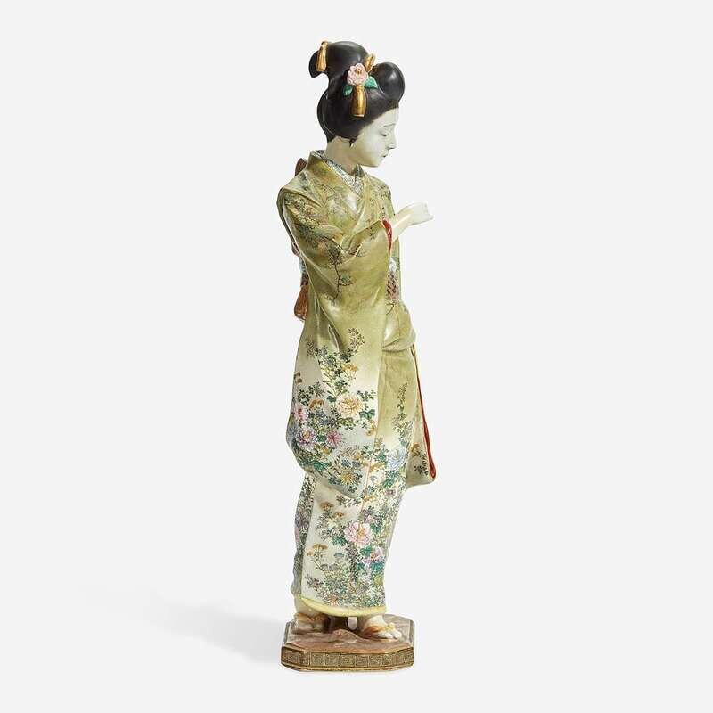 A Japanese enameled Satsuma-type pottery figure of a bijin, Kinkozan studios late 19th/early 20th Century