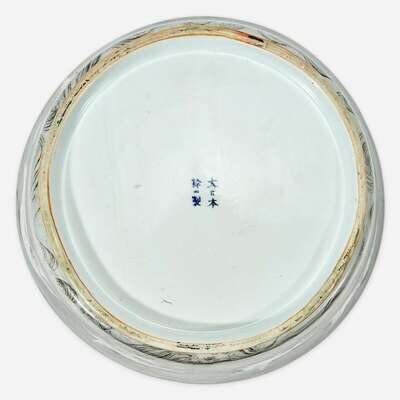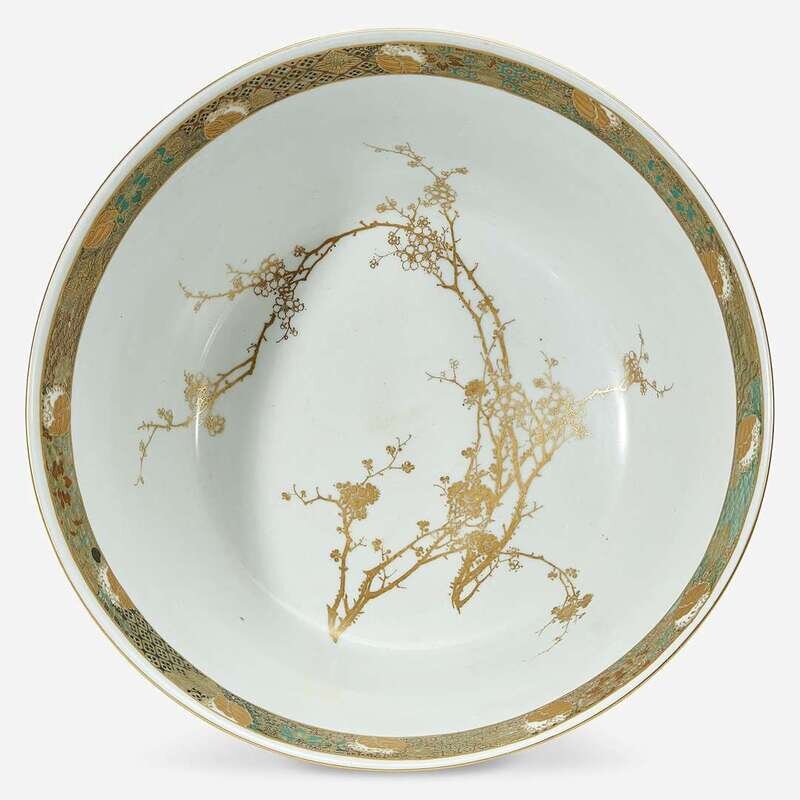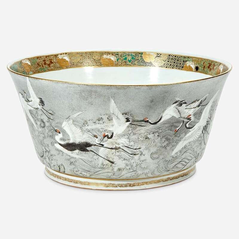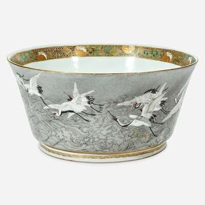 A large Japanese enameled porcelain "Cranes and Waves" bowl, Kanzan Denshichi (1821-Circa 1890) Meiji period, late 19th Century