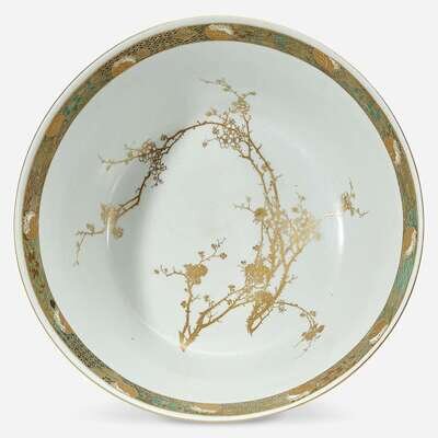Of tapered cylindrical form, the exterior decorated en grisaille with flying cranes above crashing waves, punctuated by areas of color. The interior with flowering prunus in gilt, "brocade" border to rim, underside inscribed "Dai Nippon Kanzan sei".