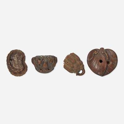 Comprising two carved as wasp nests, one signed Masatomo, the other unsigned; a flower and leaf; and a double toad netsuke, signed (4).